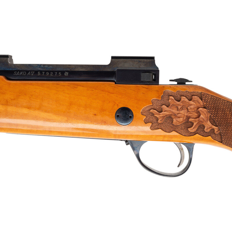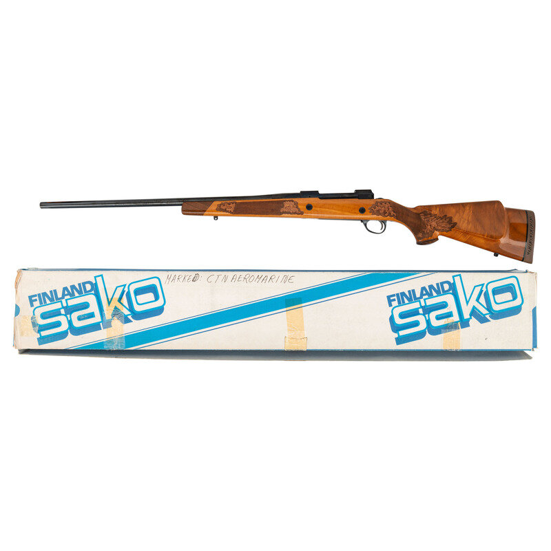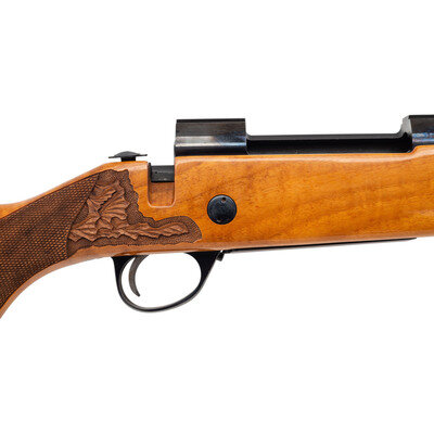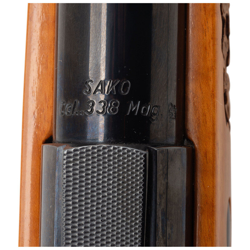 .338 Magnum. 24.5" barrel length. SN: 579275. Blued metal finish with polished bolt body set in an engraved and polished French walnut Monte-Carlo style stock with rosewood forend and pistol grip caps. Bolt-action internal magazine fed repeating rifle featuring a matted optics mounting dovetail rail on the receiver and front and rear sling swivel studs. Stock features deep relief engraved oak leaves over a beaded ground embellishing the ends of the fine checkering to the wrist and forend. Rosewood pistol grip cap mounts an unsigned silver oval plate. Magazine floorplate decorated with {Reindeer within a wreath} detail and leaf scroll over the underside of the triggerguard. Standard make and model markings with the importer mark beneath the barrel reading IMP'D BY STOEGER INC. N.J. Rifle comes in its original cardboard box with the owner's manual, two one-inch scope rings, and two sling loops.