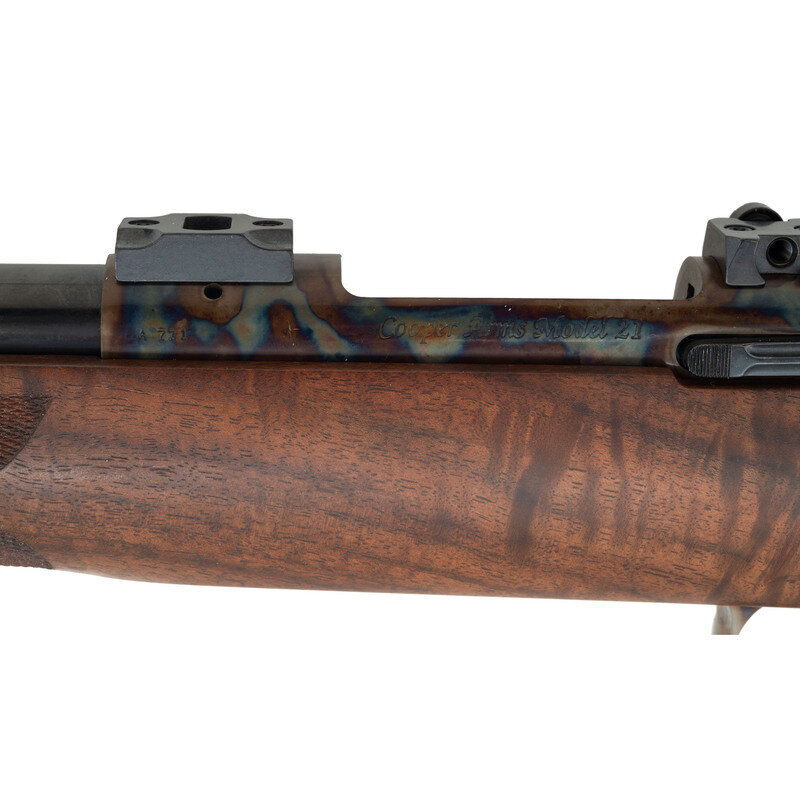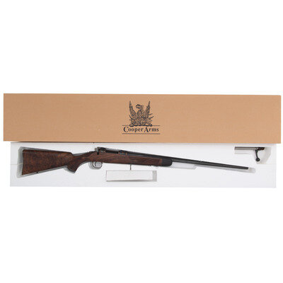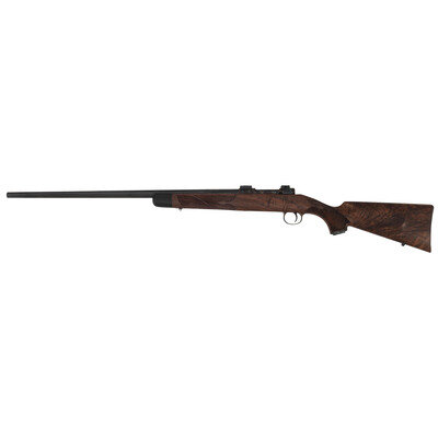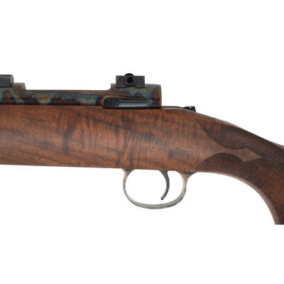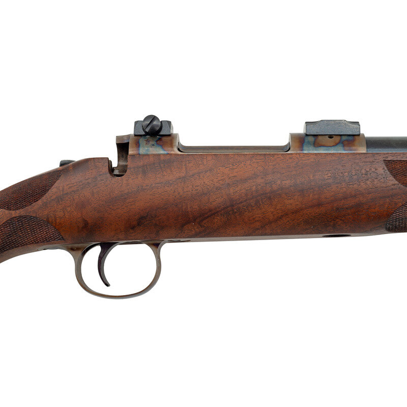 .223 Remington. 24" round to octagonal barrel. SN: A711. Blued metal finish to barrel and case hardened finish to receiver, with blued and case hardened bolt. Figured Claro walnut stock has fleur-de-lis checkering to semi pistol grip and forearm, with ebony forend and blued steel grip cap. Bolt action rifle with an internal box magazine, double sling studs, and scope mounts to receiver. Included with original box.