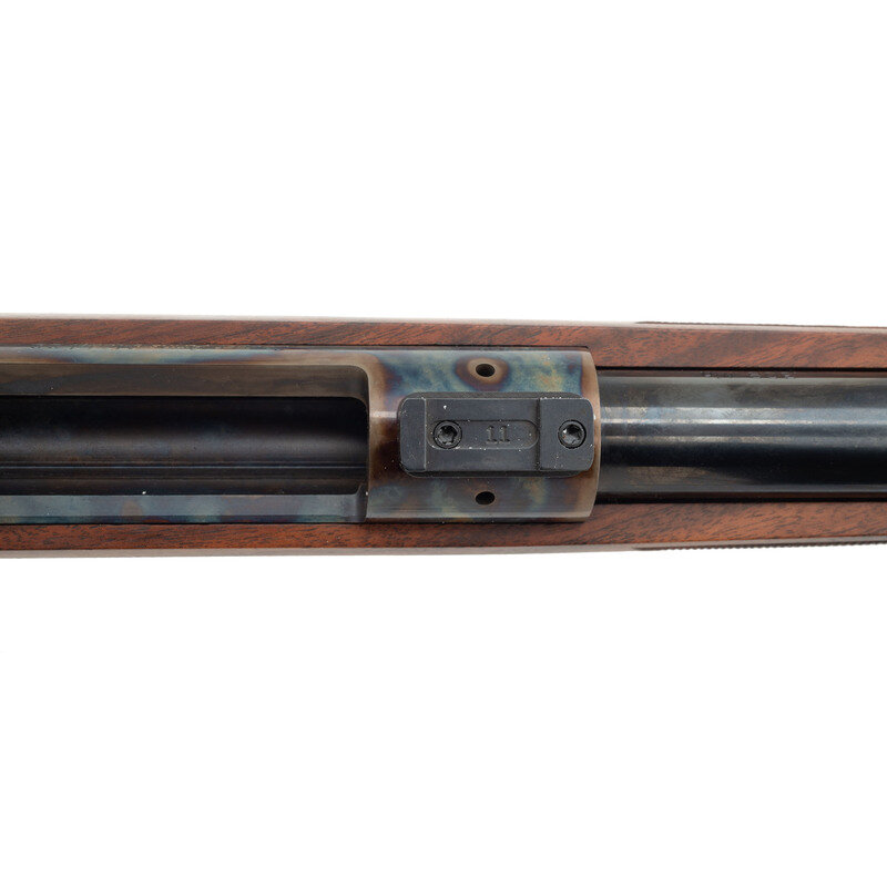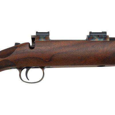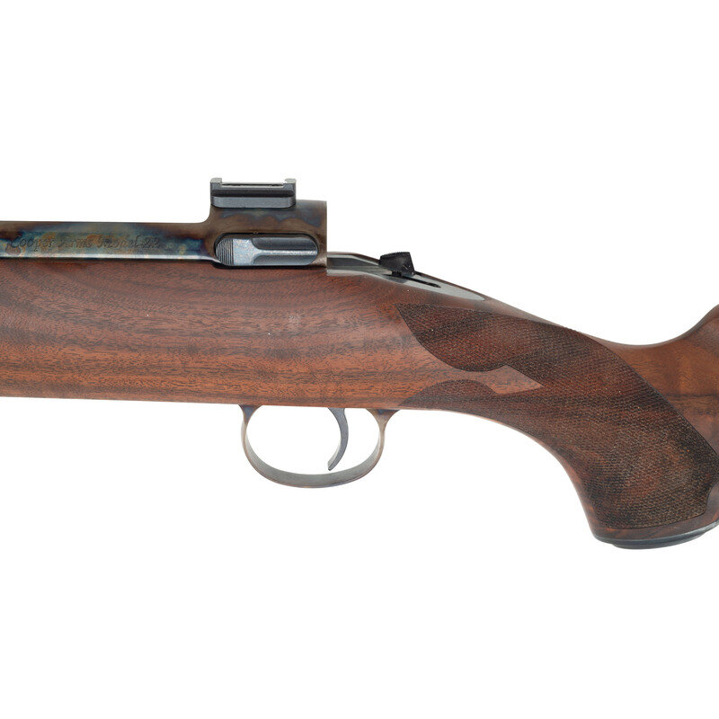.308 Winchester. 24" round to octagonal barrel. SN: PVE737. Blued metal finish to barrel and case hardened finish to receiver. Bolt also blued and case hardened. Figured Claro walnut stock has fleur-de-lis style checkering to semi pistol grip and forearm, with ebony forend cap and cheek rest to left side of butt. Bolt action rifle without iron sights. Item features an internal box magazine, dovetail scope mounts, and double sling studs. Includes original box.