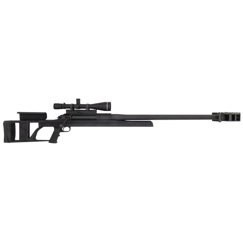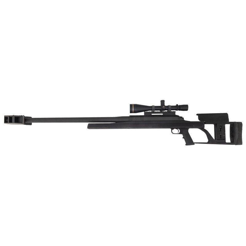 .50 BMG. 30" barrel length. SN: US70405. Black Nitride finish overall mounting black synthetic furniture with rubber recoil pad, adjustable cheek rest, and triple port muzzle brake. Bolt action single shot rifle with picatinny rail to the receiver mounting a LEUPOLD VARI-X III 8.5-25x50mm LONG RANGE scope. Maker markings on the left receiver show {ArmaLite} logo over GENESEO ILLINOIS followed by AR-50. Item comes in a black synthetic BAGMASTER soft case.