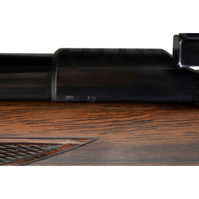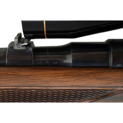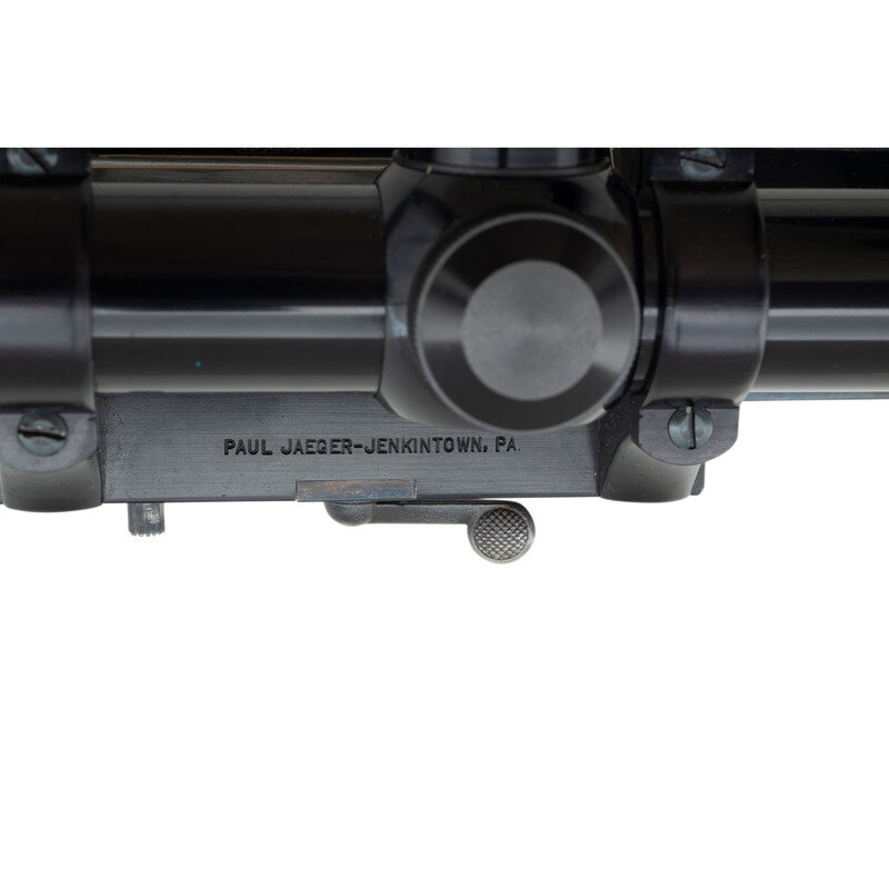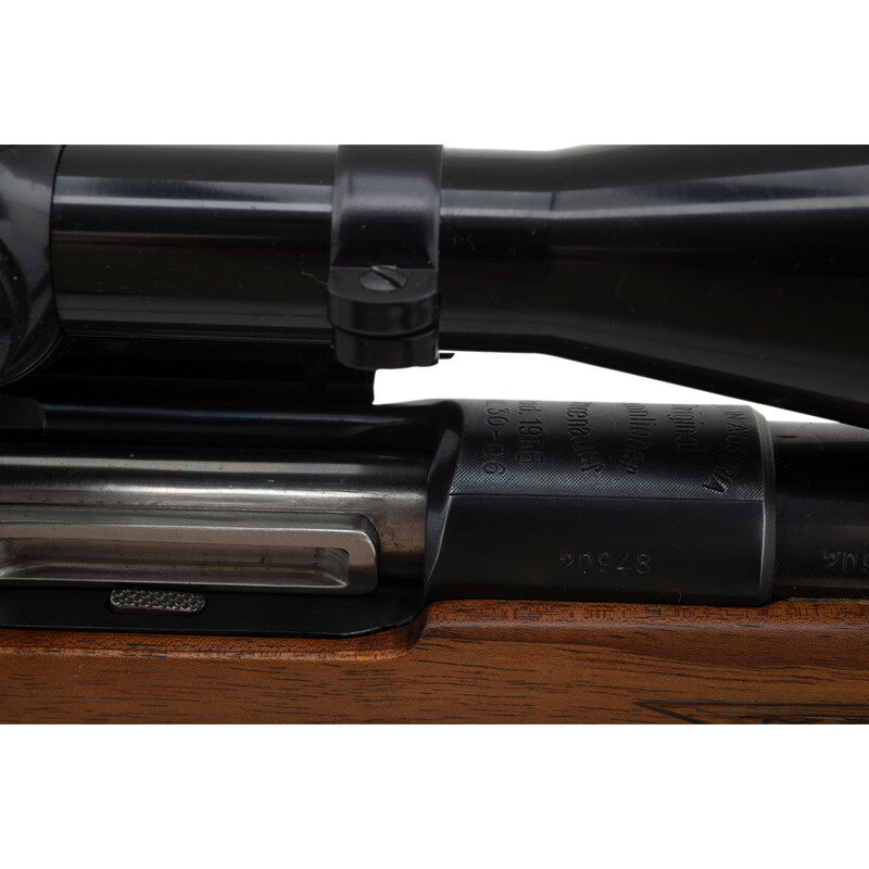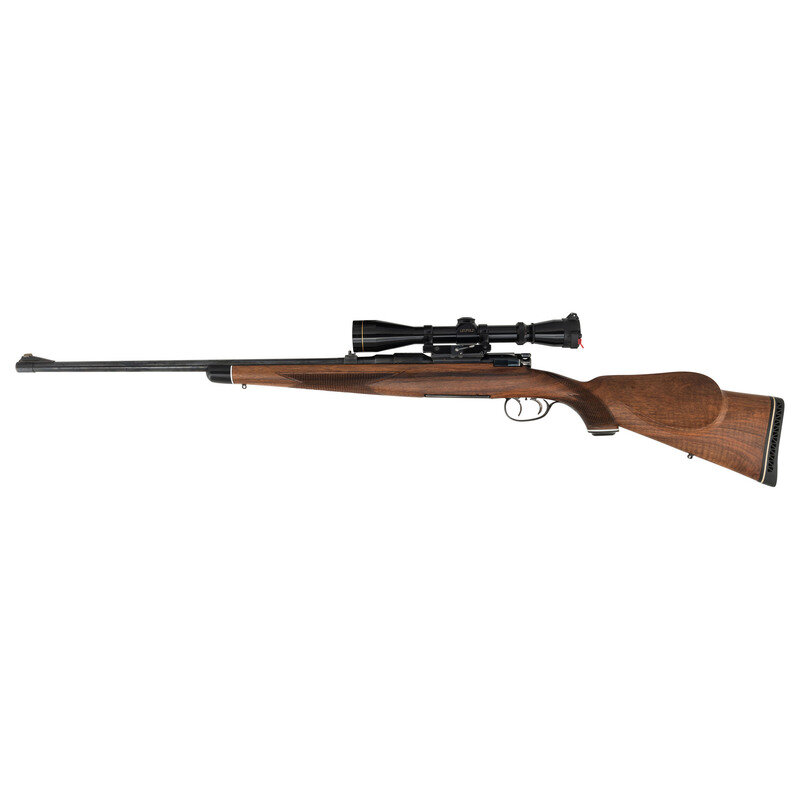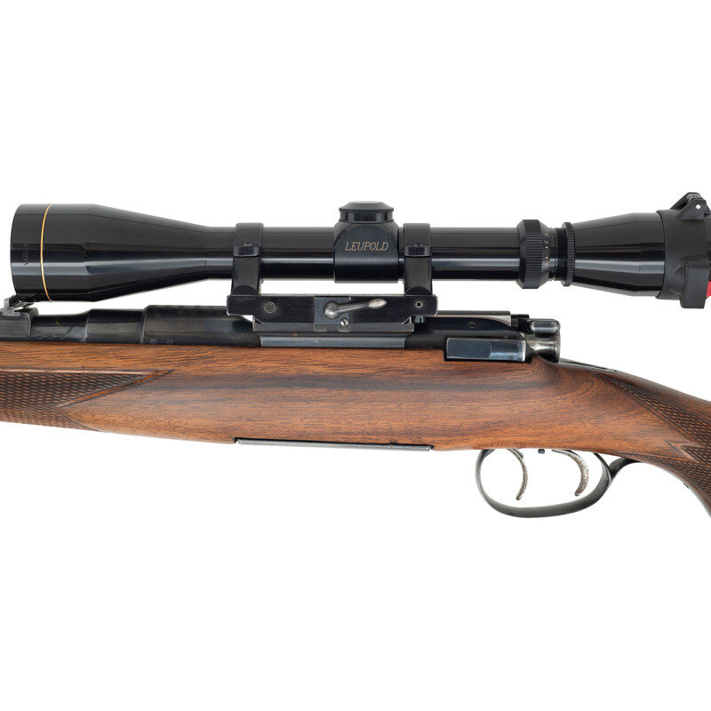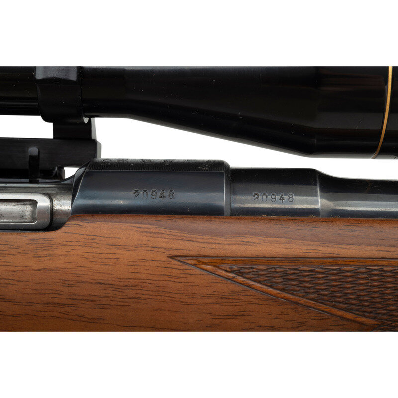 .30-06 caliber. 22" barrel length. SN: 20948. Blued metal finish with polished bolt. Walnut stock has checkering to semi pistol grip and forearm, with cheek rest, ebony forend cap, and black synthetic cap to grip. Bolt action rifle with two leaf notch express rear sight, blade front sight, and a Leupold Vari-X IIc 3-9x40mm scope on a Paul Jaeger Quick Detach side mount. Item features an internal rotary magazine, adjustable double set triggers, double sling studs, spoon handle bolt, and a vented rubber recoil pad. Includes Butler Creek ocular lens cover.