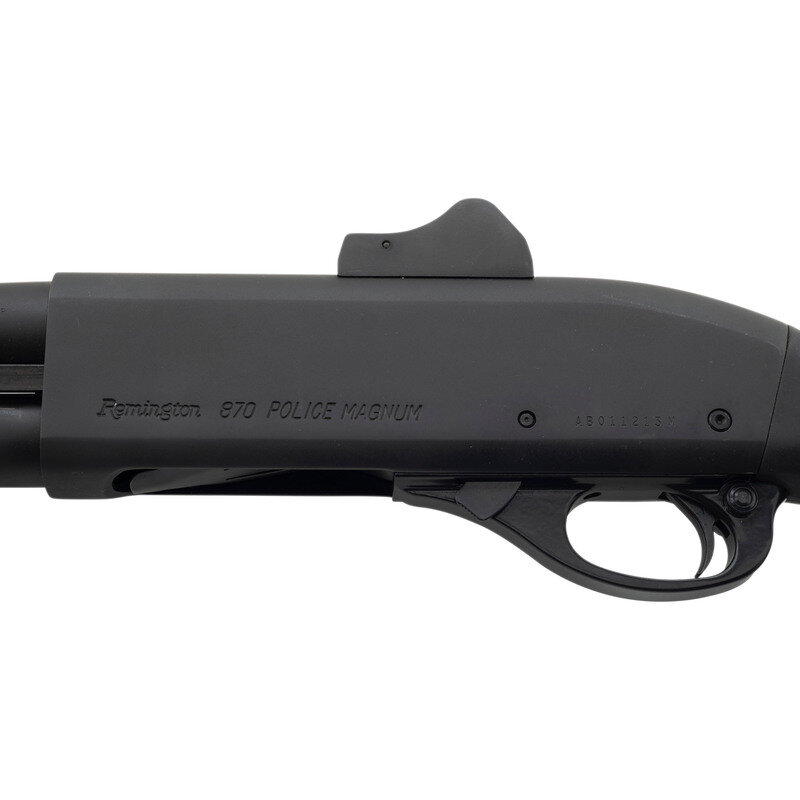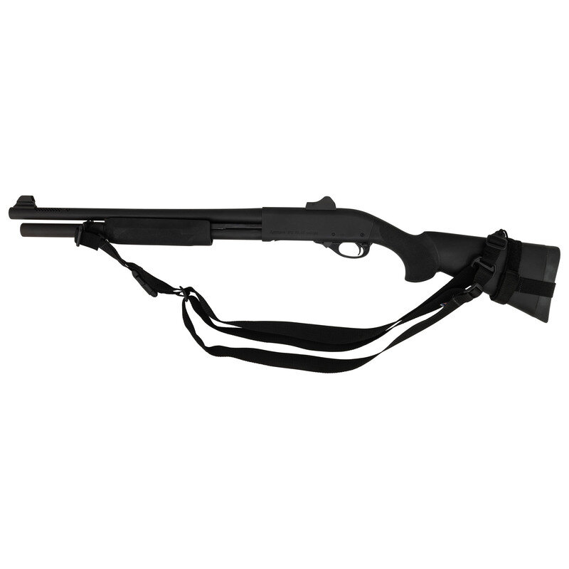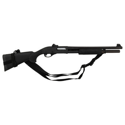 12 gauge. 18" barrel length. SN: AB011213M. 2.75" or 3" chamber length. Improved cylinder choke. Parkerized metal finish. Two piece black synthetic stock has rubber texturing to semi pistol grip and forearm. Slide action shotgun with shrouded adjustable peep rear sight and shrouded blade front sight. Item features barrel porting, a full tube magazine, and a rubber recoil pad. Includes a black nylon sling and owner's manual.