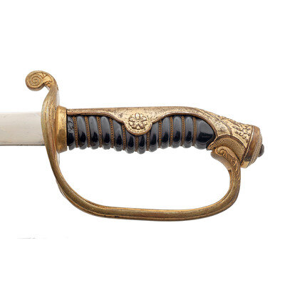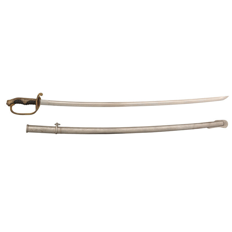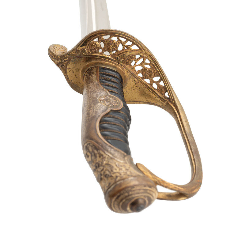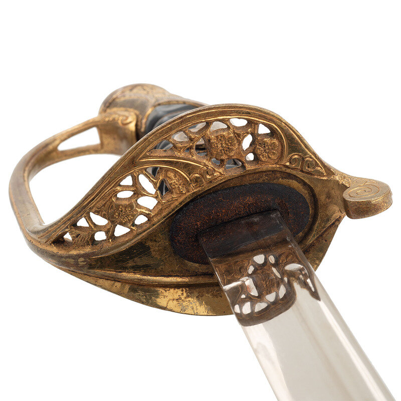 30.75" blade length. 38" overall with scabbard and hilt. Gold washed Sentoku furnishings with wire wrapped hilt, Sakura decorated backstrap, and a knuckle bow connecting to the pommel cap. Sword is of peened tang construction with a 28" fuller and 1.5" ricasso. Scabbard is nickel plated with a single ring. Blade likewise is nickel plated along its length with a machine polished line resembling a Hamon line. Imperial Japanese swords of this pattern combined European pattern metal scabbards and unsharpened blades, reflective of the sword passing into a ceremonial role, with Japanese blade geometry.