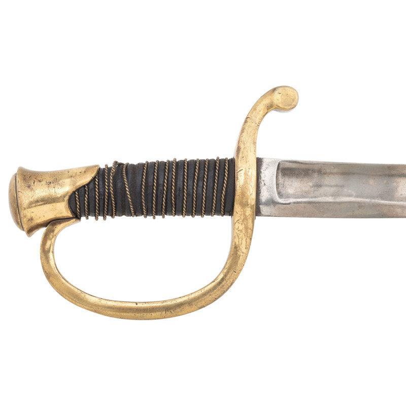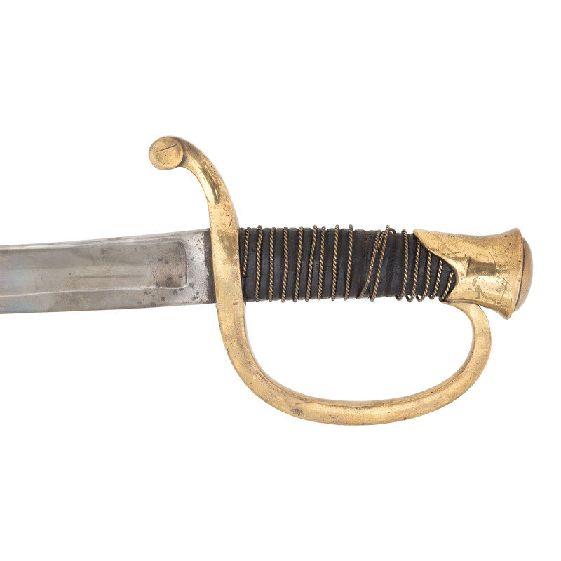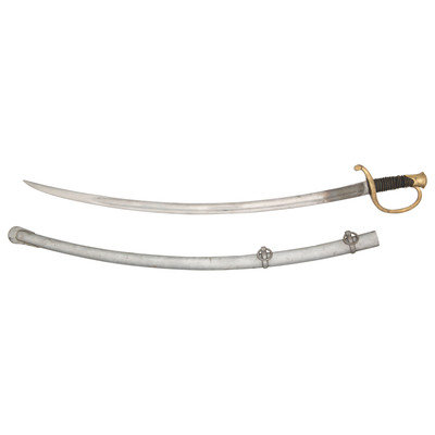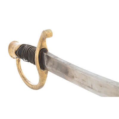 31.25" curved, single-edged blade with 25" stopped median fuller. Blade 1.25" wide at ricasso. 36.5" in overall length with a 5.5" hilt. Brass guard with knuckle blow and forward swept disc shaped upper quillon, grooved wood grip covered in leather with sixteen wraps of twisted wire. Blade is unmarked and no inspections are present on the pommel cap. Includes a lap seamed steel scabbard with two suspension rings and no provision for a throat.