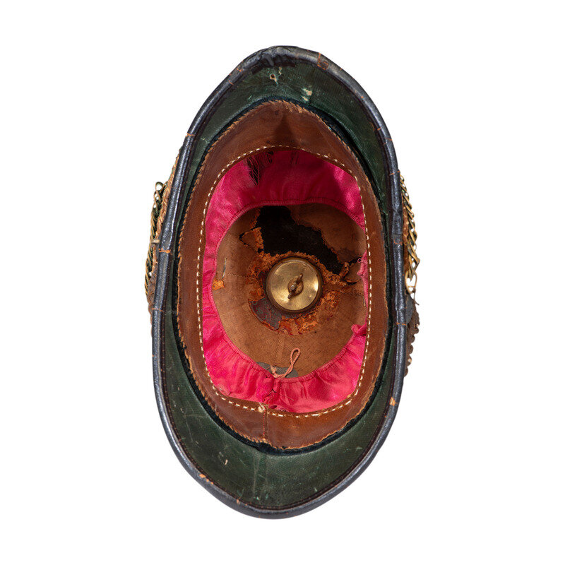 2.) New York National Guard cavalry officer pattern dress helmet by Ridabock & Co. Helmet is fabricated of cloth covered cork with a red silk liner and leather sweatband. Interior crown of the helmet retains the remnants of a RIDABOCK & CO. tag surrounding the tie-down for the plume. Shell mounts a two-piece US 7th Cavalry plate, and a yellow horsehair plume. Helmet shows the seams along both flanks typical of New York helmets.