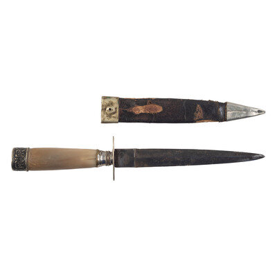 Adjustable leather belt circa late 19th to early 20th century, 1.75" and currently set for a nominal waist of 32". Made of heavy leather with uniform protecting tongue behind the two-piece "Snake Buckle" that features a 1.5" long dual swan motif buckle made of silvered non-ferrous metal. Accompanying the belt is 9.75" long dirk with a 5.875" double-edged spear point blade with a prominent median ridge. The knife has a horn grip and German silver mountings with a 1.75"x.5" oval guard. The obverse ricasso is stamped in three lines: ROBERT/LINGARD/SHEFFIELD. The knife is accompanied by a German silver mounted leather scabbard that is missing the frog button from the throat.