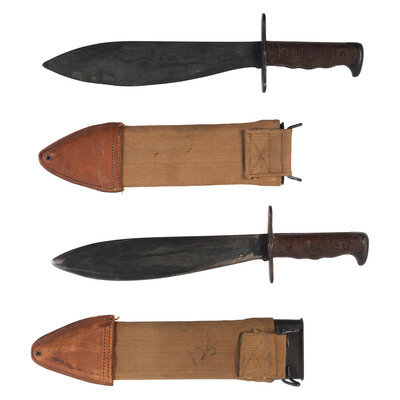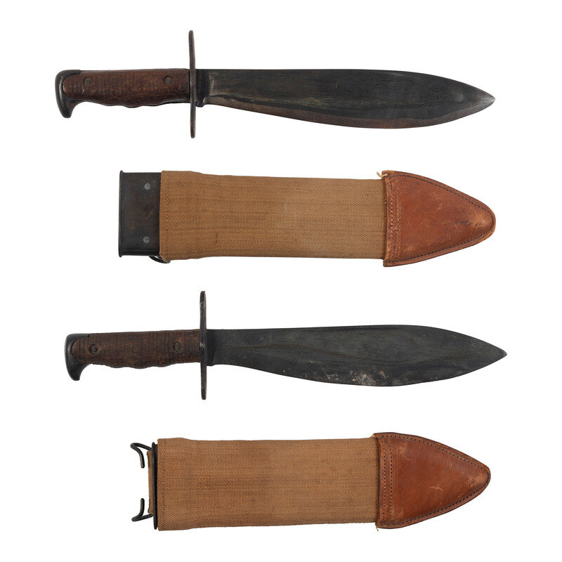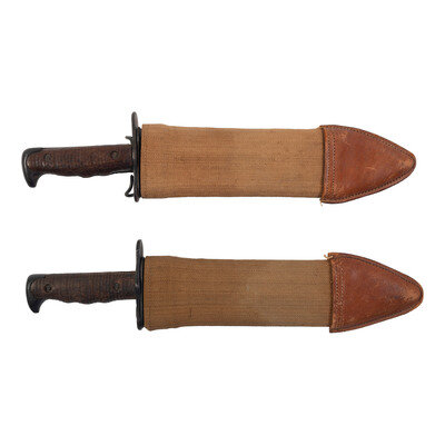 Both have 10" blades and are 15" overall. Single edged spear tip bolo knife with false edge. Wood grips and bird's head pommels. Ricassos are both marked US MOD./1917 C.T. to left side, and PLUMB/ST. LOUIS to right side. Both include scabbards.