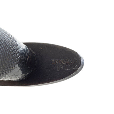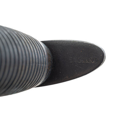 1) F-S Type II Knife. 6.5" double-edged dagger blade, 11.5" in overall length with 5" round, palm swelled hilt with checkered grip. Oval cross guard marked {Broad Arrow} B2 on its top and then overstamped ENGLAND. Blued finish throughout. The knife is accompanied by the typical brown leather F-S knife scabbard with blued steel drag, missing the elastic retainer strap. This late Type II knife was likely produced in late 1942.