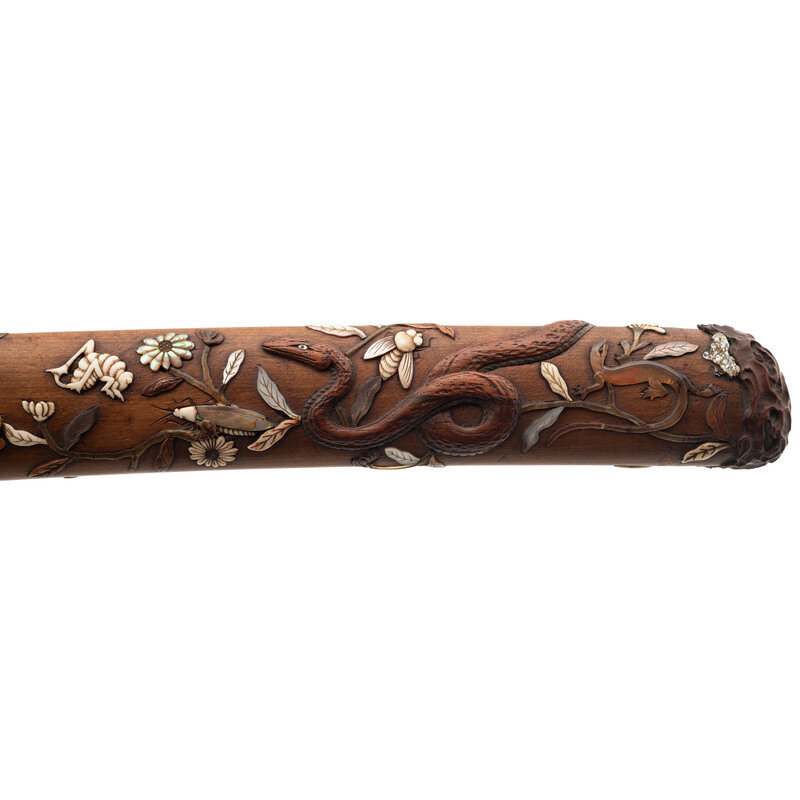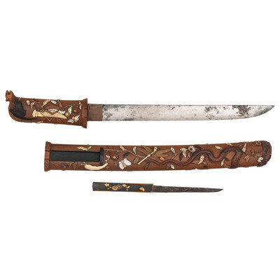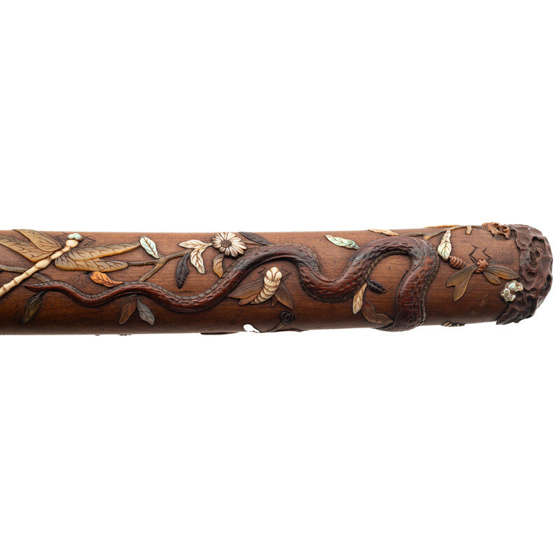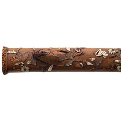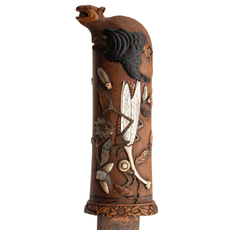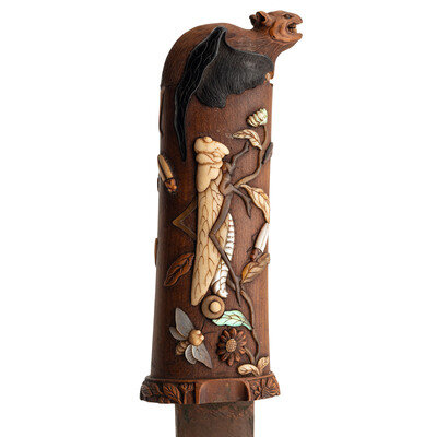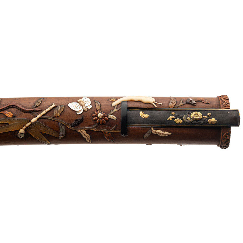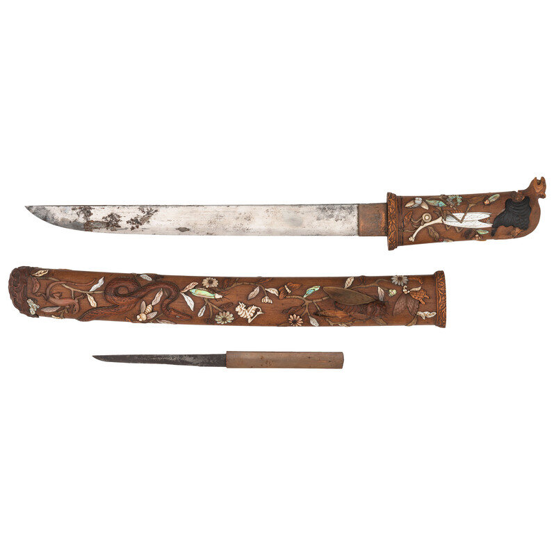 11.7" Nagasa (Blade Length). 19" overall with Tsuka (Hilt) and Saya (Scabbard). Hira-Zukuri pattern blade with Sugu (Straight) Hamon line mounting matching wood Tsuka and Saya with inlaid scenes of nature and accompanied by a signed Kogatana with gold chrysanthemum and butterfly designs. Tsuka is inlaid with ivory, mother of pearl, and black patinated finish Shakudo. A grasshopper meanders along the right side with a praying mantis adorning the left, both ensconced among smaller insects and branches. A wooden rat perches at the tang, baring its teeth. Saya utilizes the same materials and features a prominent snake design flowing around both sides and edging its way toward a large Cicada perched near the throat. Ivory Mekugi pin has not been removed in order to preserve it.