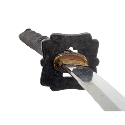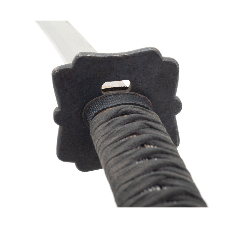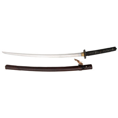 26.5" Nagasa (blade length). 38.5" overall with Tsuka (hilt) and Saya (scabbard). Aoi Gata style iron tsuba with Kozuka and Kogai hitsu-ana. Blade features a Shinogi-Zuguri shape. Fuchi composed of Shakudo with a blackened patinated finish and a checkered pattern overall. Kashira (Pommel Cap) shares the same material with a smooth finish. Hilt is wrapped in rayskin with one menuki on the left side and black cord wrap. Nakago (Tang) is unsigned. Sword comes in a wood core Saya (Scabbard) wrapped in stitched brown leather with a pair of REINDEER/FINISH snaps on the throat. Scabbard wrap is cut down roughly over the Kurigata suggesting it was hand fit to this Saya after its construction.