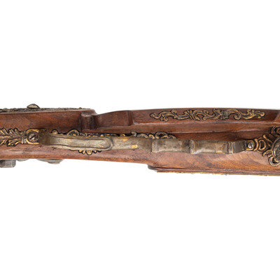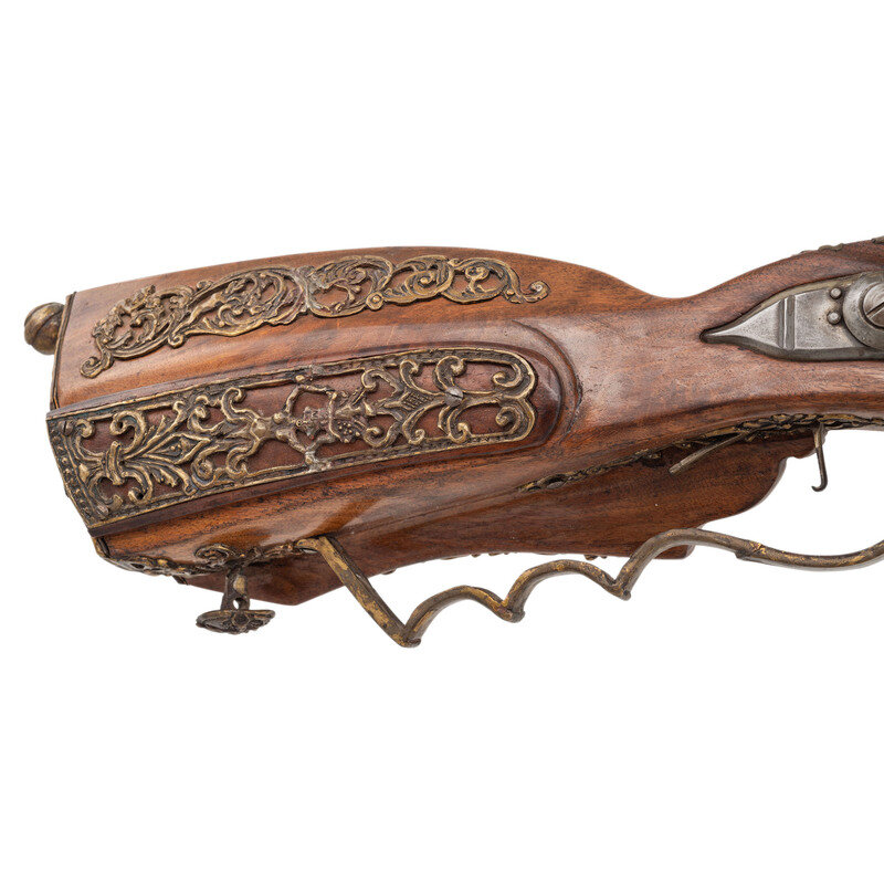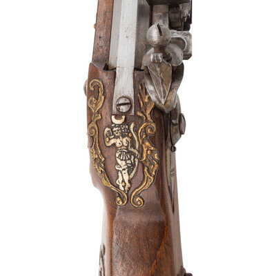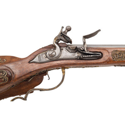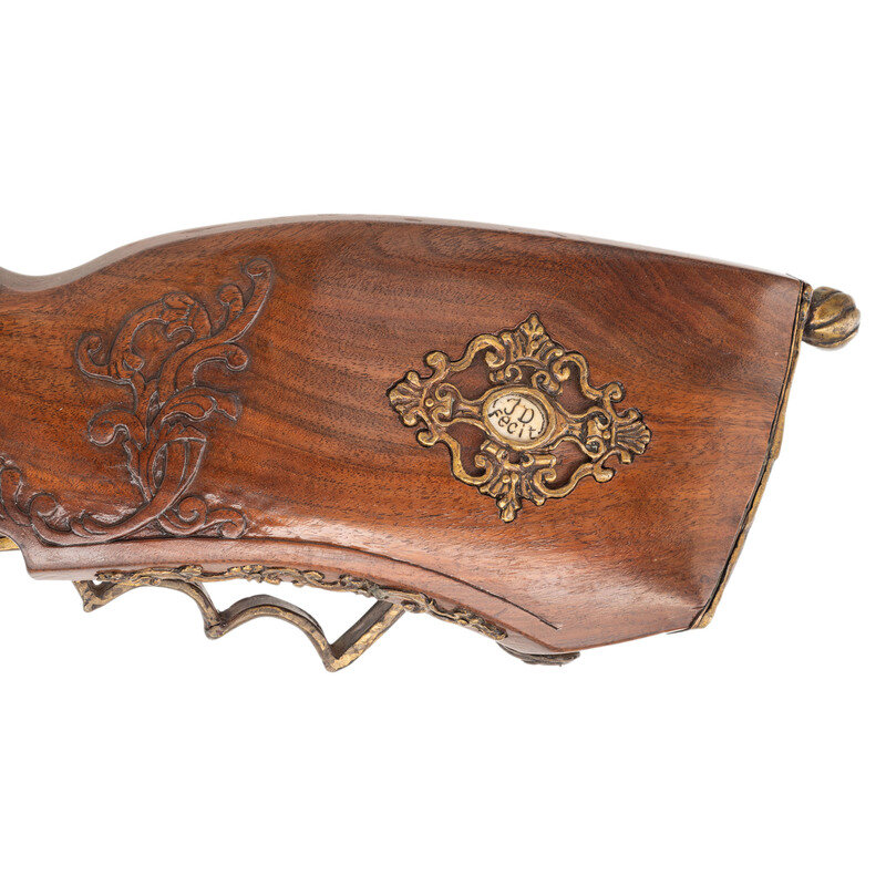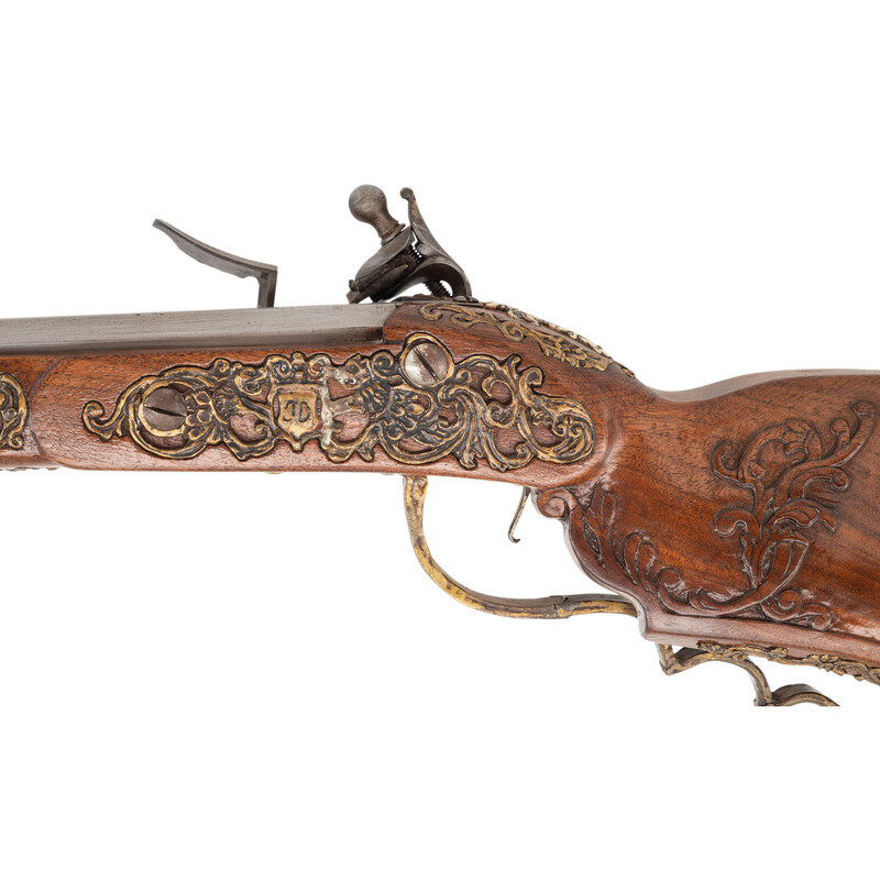 .40 caliber. 31" octagonal barrel. SN: NSN. Finish left in the white. Walnut stock has a large drooped cheekrest to left side, along with some rococo style carvings to grip and incised lines to forearm. Flintlock rifle with two leaf folding notch rear sight and blade front sight. Item features wax-cast brass rococo stock fittings, with carved stag horn inlay depicting a nymph to top of grip. Also featured is a patchbox with lid showing a cast brass fitting of rococo scroll surrounding what appears to be a nymph. Includes a sling loop to forearm and a cast brass sling stud to butt. Crafted in the style of an 18th century jaeger rifle made by Swedish gunmaker Jonas Schertiger the Younger, and housed at the Metropolitan Museum of Art.