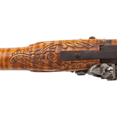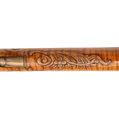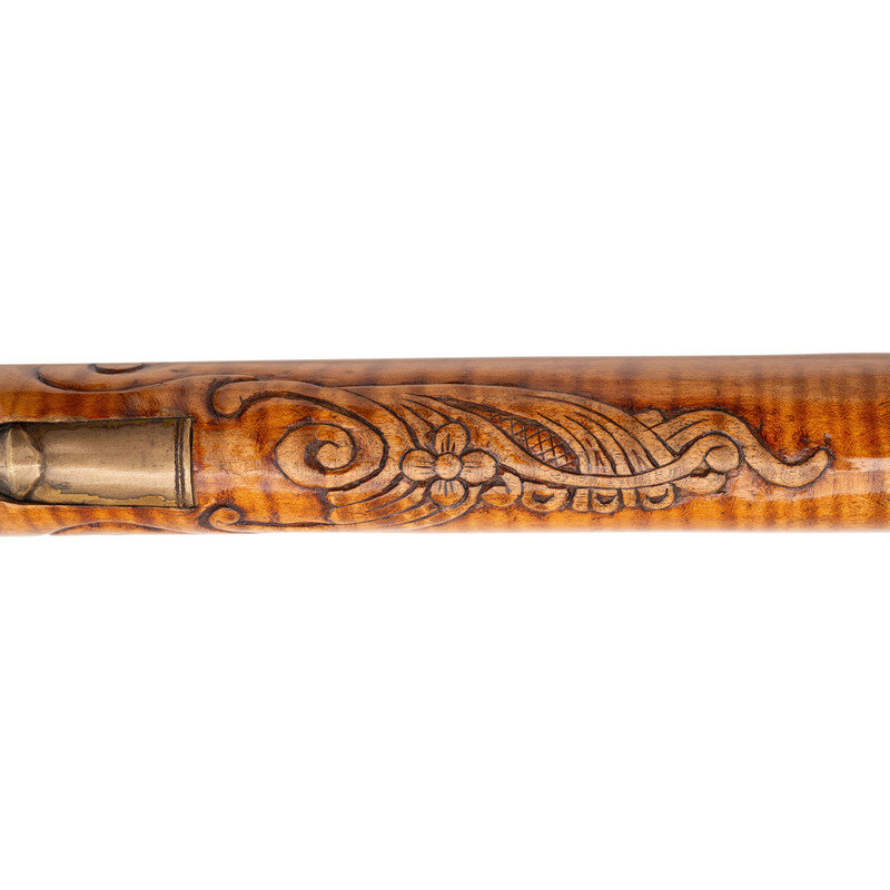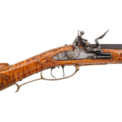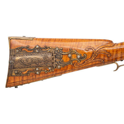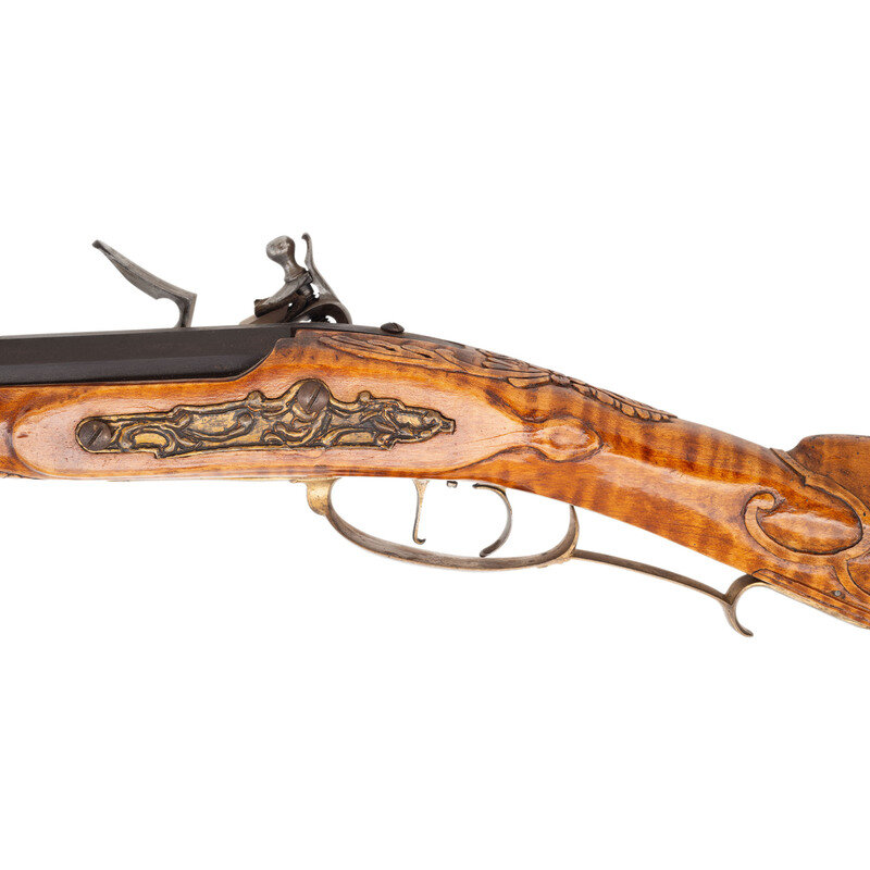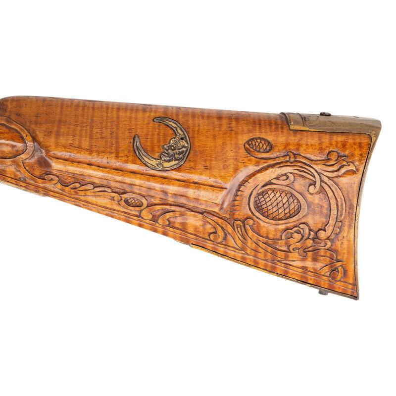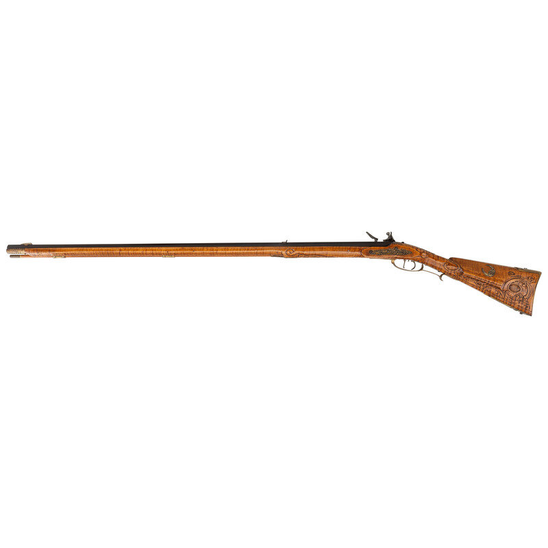 .50 caliber. 40" octagonal barrel. SN: NSN. Browned metal finish. Honey colored curly maple stock with carved C-scrolls, foliate scroll, cross-hatched lines, and incised lines to butt and forearm, with cheekrest to left side. Flintlock rifle with notch and blade sights. Item features double set triggers, pierced patchbox with 12 screws, and push button patchbox release to toe. Stock is fitted with wax-cast brass fittings including patchbox, plates, and a grotesque crescent moon to cheekrest. Includes brass tip ramrod. Crafted in the style of York County long rifle maker George Eister.