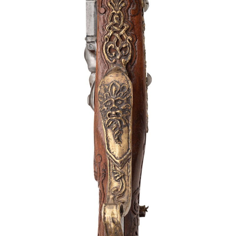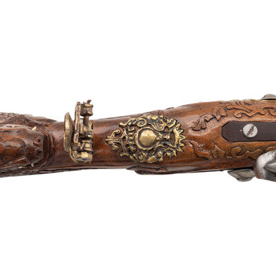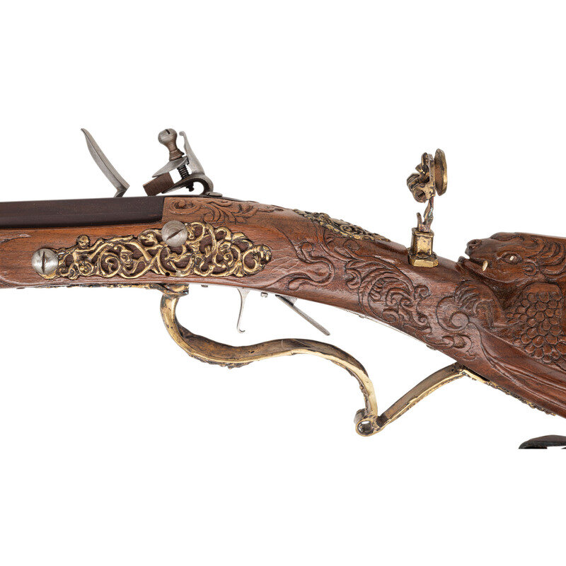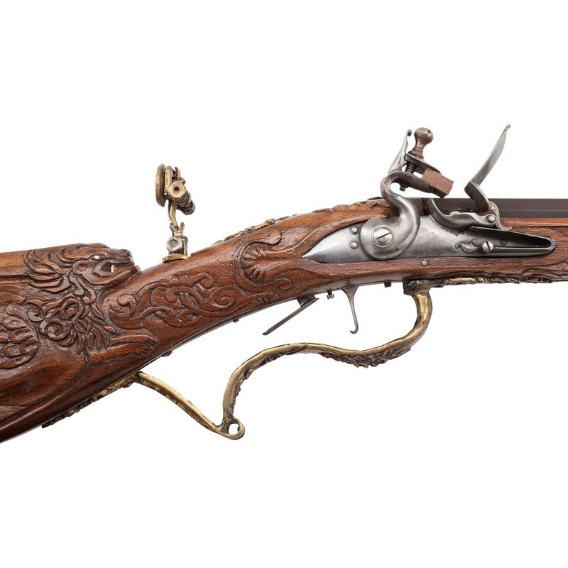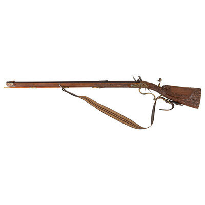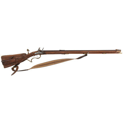 .40 caliber. 33.5" octagonal barrel. SN: NSN. Browned metal finish. Walnut stock has ornate and extensive carvings of foliate and rococo scroll overall, as well as a carved beast grotesque to comb, drooped cheekrest to left side, and fluting to both butt and forearm. Flintlock jaeger rifle with adjustable cast brass diopter tang sight, two leaf folding notch rear sight, and brass fleur-de-lis front sight. Item features a patchbox on right side of butt, sling loop and stud, and double set triggers. Stock features wax-cast brass fittings with ornate filigree intertwined with foliate and grotesque motifs, as well as a stag horn forend cap. Includes a leather and cloth sling. Is without flint and jaws are fitted with a small block of wood.