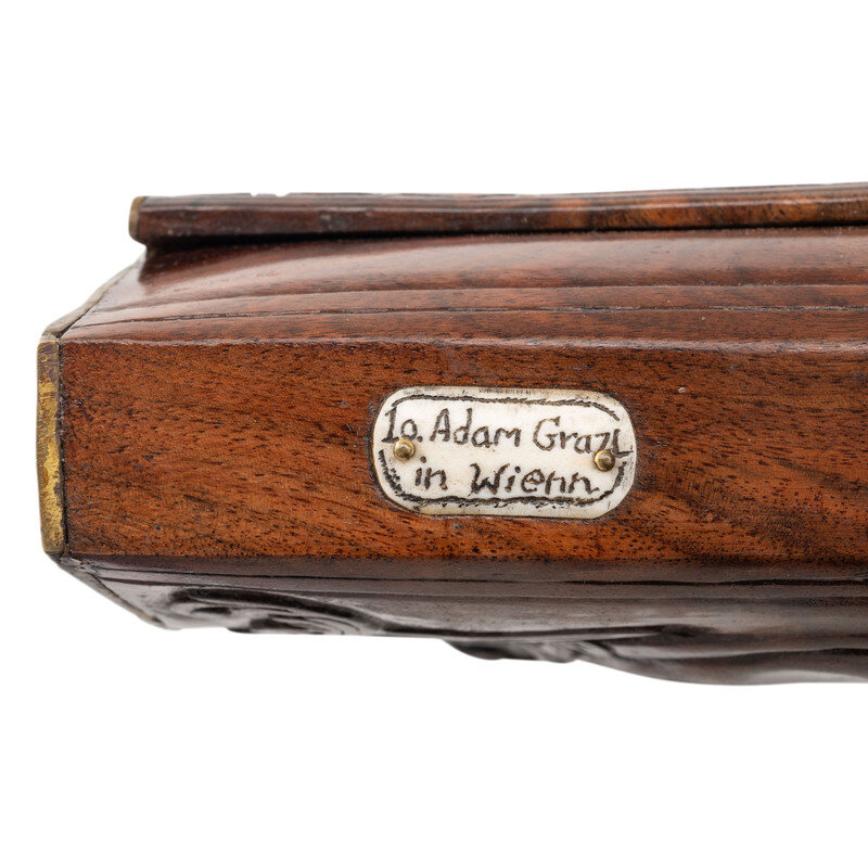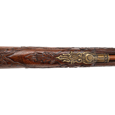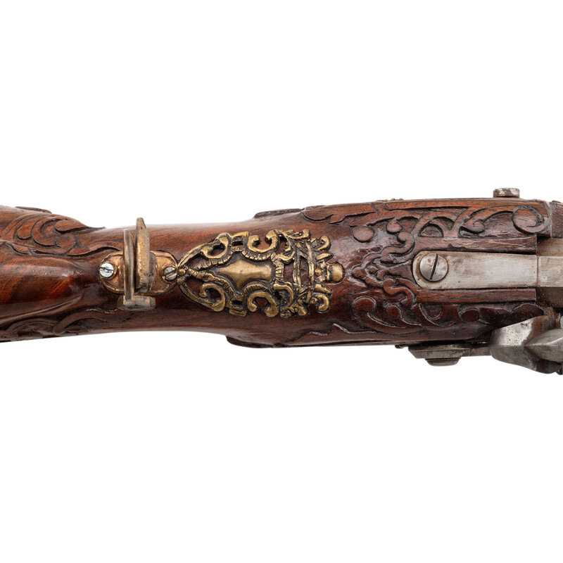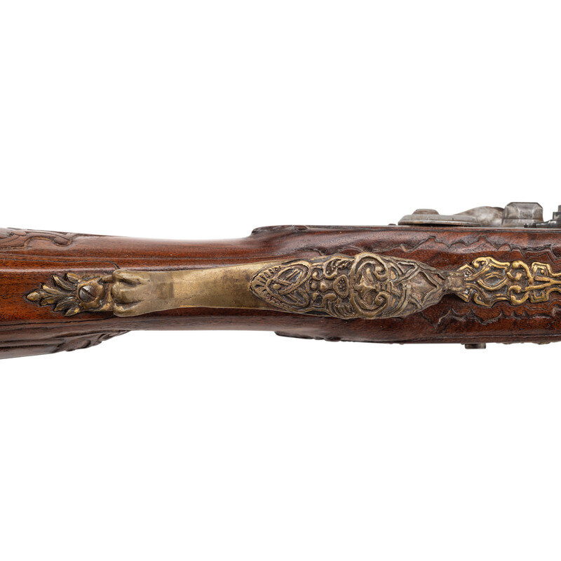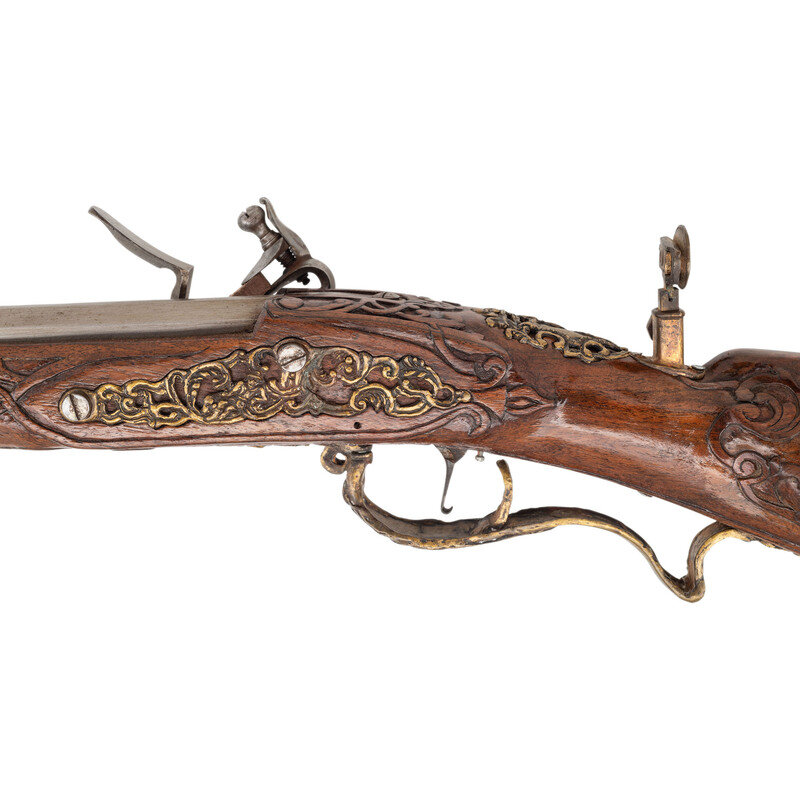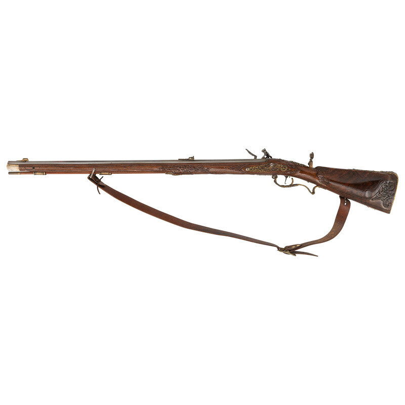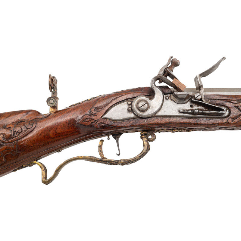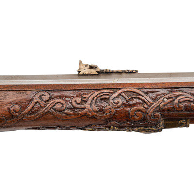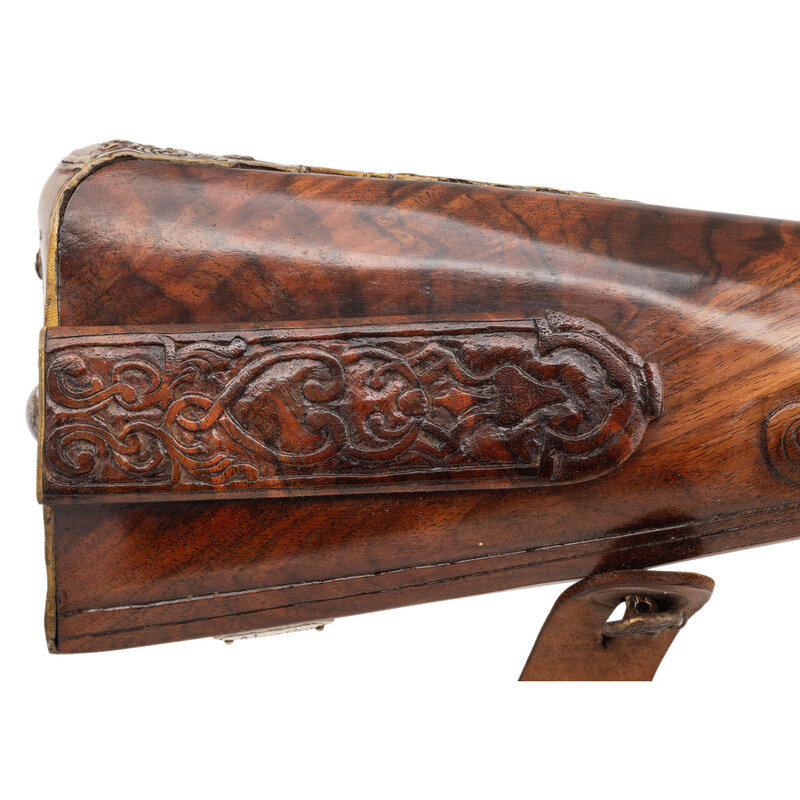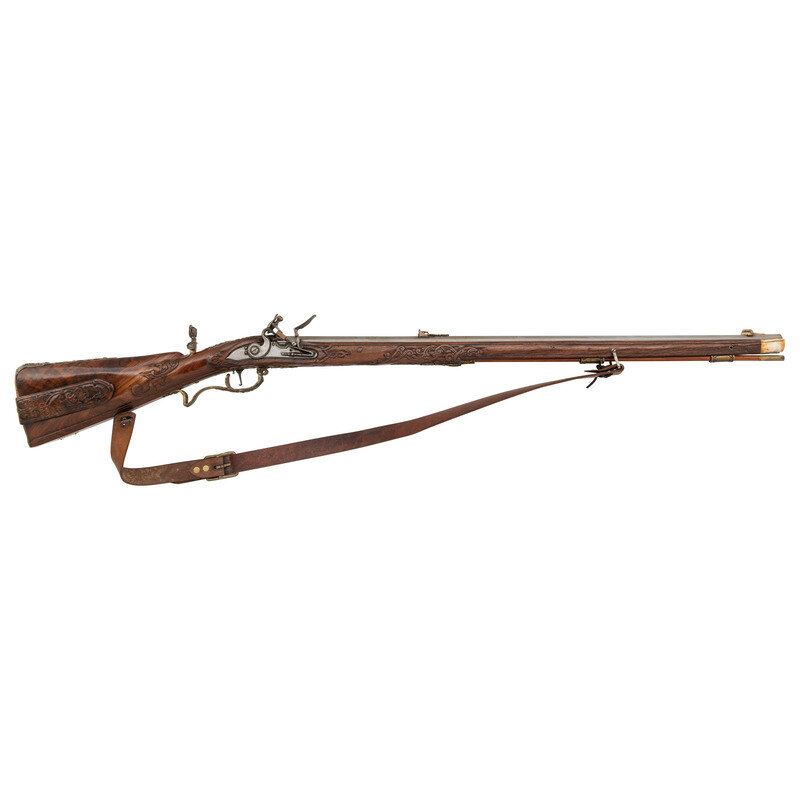 .50 caliber. 32" octagonal barrel. SN: NSN. Finish left in the white. Black walnut stock has ornately carved rococo scroll with foliate motifs, as well as incised lines and a cheekrest to left side. Flintlock rifle with a cast brass adjustable diopter tang sight, brass two leaf folding notch rear sight, and brass fleur-de-lis blade front sight. Item features a patchbox on right side, sling loop and stud, and brown leather sling. Stock features wax-cast brass filigree fittings with intertwined motifs including foliage, a lounging hunter and his dog to sideplate, and Diana the Huntress on buttplate. Includes brass tip ramrod. Item is without flint, jaws are currently fitted with a small block of wood.