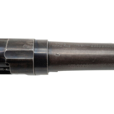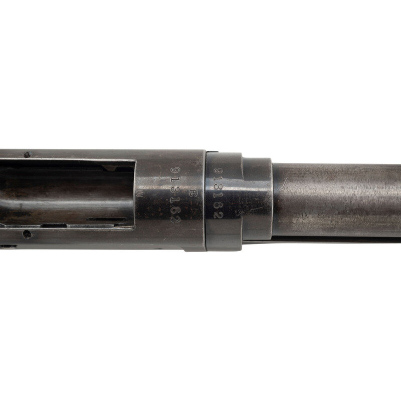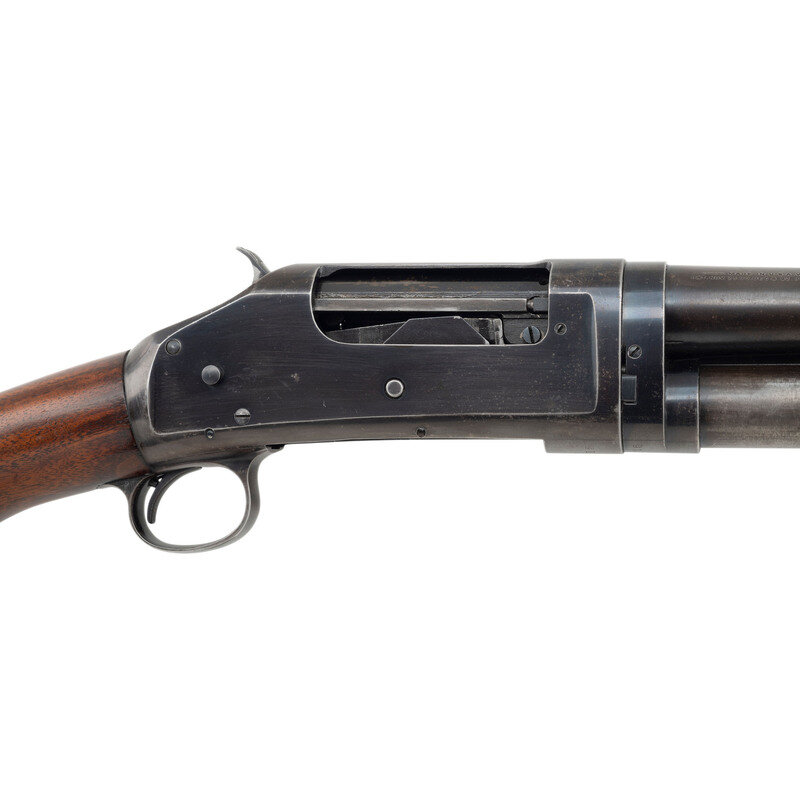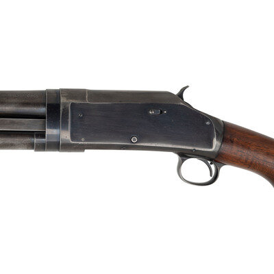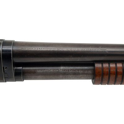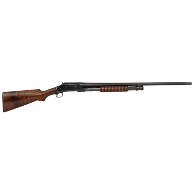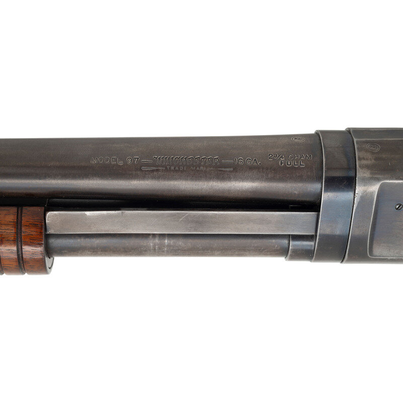 16 gauge. 28" barrel length. 13.5" length of pull. 2.75" chamber length. Full choke. SN: 913162. Blued metal finish. Two piece figured walnut stock has a plain semi pistol grip and grooved corncob forearm. Slide action shotgun with a steel bead front sight and half tube magazine. Barrel is marked MODEL 97.