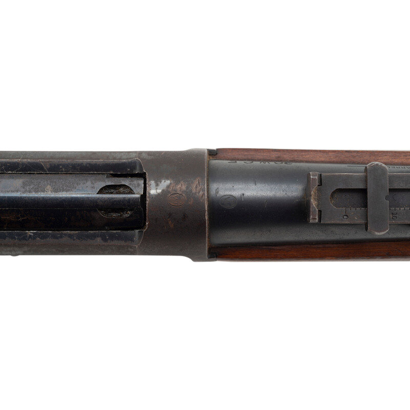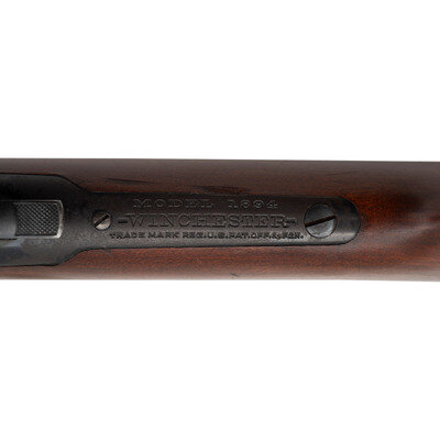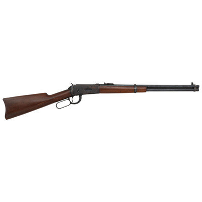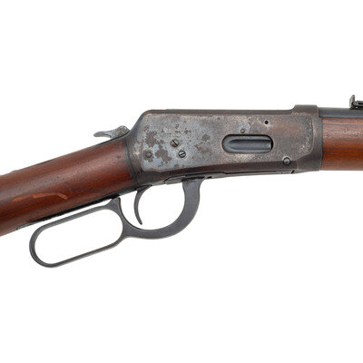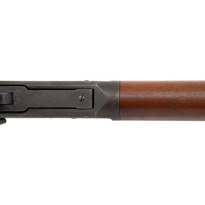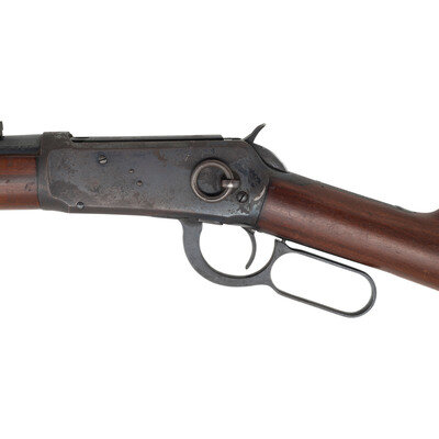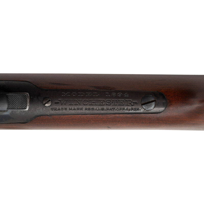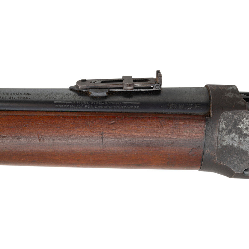 .30-30 WCF. 20" barrel length. SN: 781341. Blued metal finish. Two piece walnut stock has a plain straight grip and forearm. Lever action rifle with adjustable folding ladder notch rear sight and blade front sight. Item features a saddle ring to left of frame and a full tube magazine.