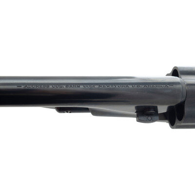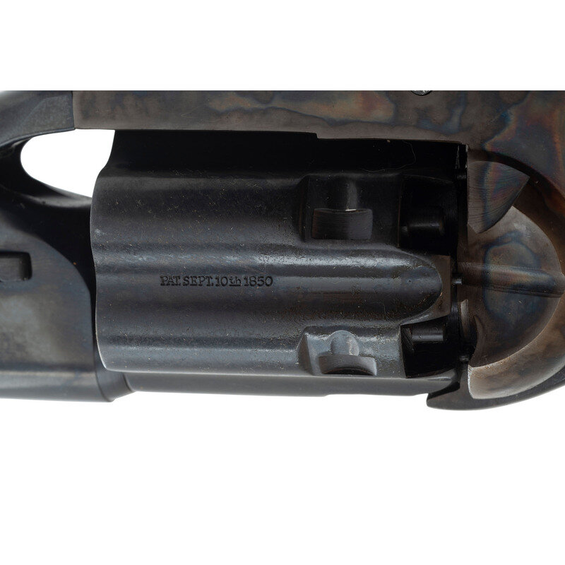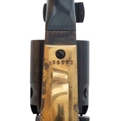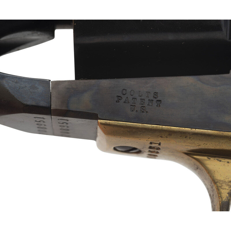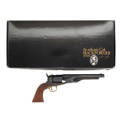 .44 Caliber. 8" barrel length. SN: 208951. Blued metal finish with casehardened frame, loading lever, and hammer mounting one piece smooth walnut grips. Single action six-shot percussion revolver with fluted cylinder and round barrel with frame cut for mounting a shoulder stock. Sights consist of a hammer notch and German Silver front blade sight. Markings include three line COLTS/PATENT/U.S. to the left frame and 44 CAL to the left triggerguard. Top of the barrel is marked in a single line -ADDRESS COL. SAML COLT NEW-YORK U.S. AMERICA-. Patent marking on the cylinder reads PAT. SEPT. 10th 1850. Comes in a black cardboard box with standard Colt manufacturer markings. Included in the box are the owner's manual and black powder shooter flyer.
