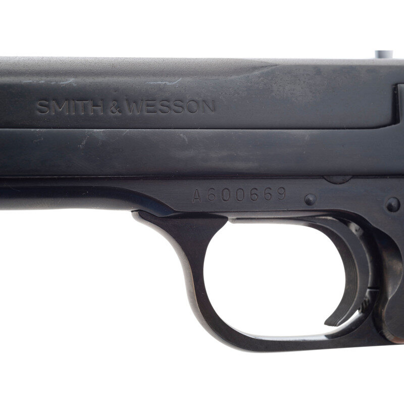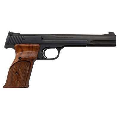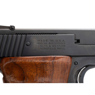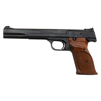 .22 LR. 7" barrel length. SN: A600669. Blued metal refinish overall with varnished and checkered walnut grips. Simple blowback operated striker action autoloading pistol fed by detachable single stack magazines. Item mounts adjustable target rear notch and Patridge front sights. Left slide shows the Smith & Wesson trade mark with the four-line address to the right. Item displays the standard make, model, and caliber markings. Muzzle is internally threaded. Comes with one S&W marked magazine.