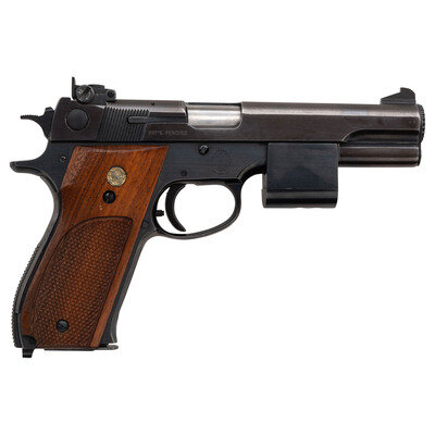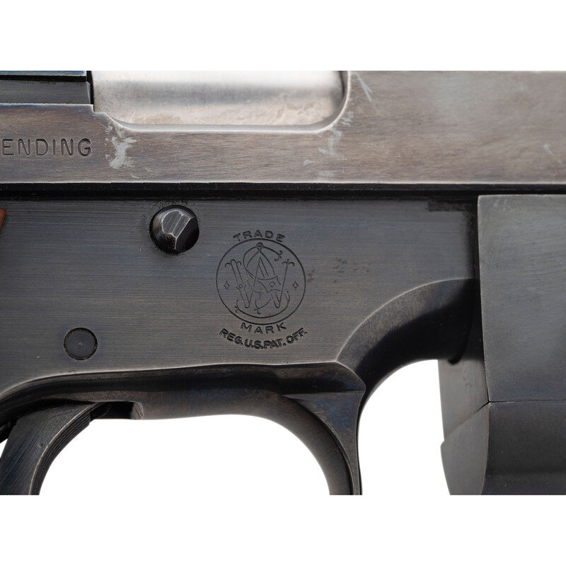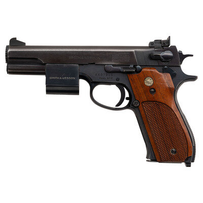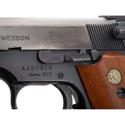 .38 Special Mid-Range. 5" barrel length. SN: A487916. Blued metal finish with finish transitioning to plumb on the slide, and mounting checkered wood Smith & Wesson medallion grips. Single-action short-recoil operated autoloading pistol fed by detachable single-stack magazines. Item features adjustable target rear notch and front Patridge sights, a slide mounted safety, and mounts a SMITH & WESSON marked weight attached to the forward frame rails. Backstrap is knurled, and the front strap and trigger both feature grip serrations. Item features a removable barrel bushing. The left slide is marked SMITH & WESSON followed by the four-line address marking. The Smith & Wesson trademark appears on the right frame, and the model marking MODEL 52-2 to the left below the serial number. Pistol mounts an adjustable trigger, and comes with one blued magazine.