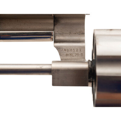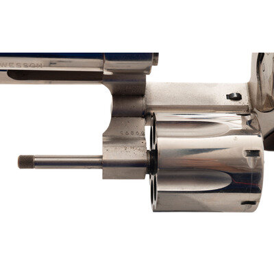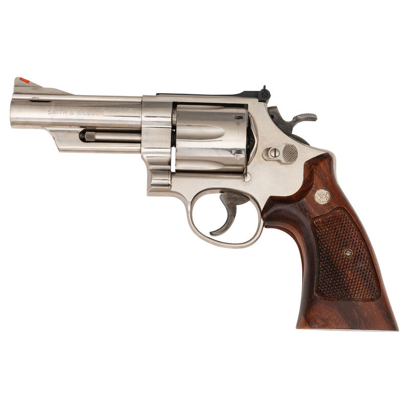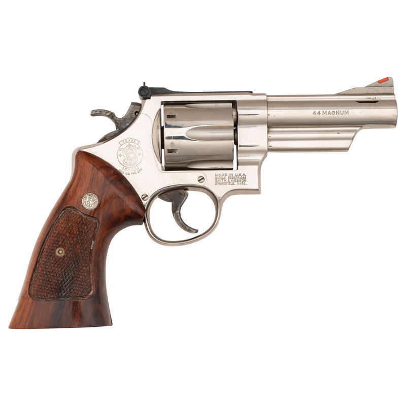.44 Magnum. 4" barrel length. SN: AWH6577. Nickel plated finish overall with casehardened trigger and hammer, and mounting checkered walnut Smith & Wesson medallion grips. Double action hand ejector six-shot revolver mounting adjustable target rear notch and red insert front ramp sight on a ported barrel. Item shows standard make and model markings, and lacks the later internal safety lock.