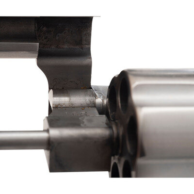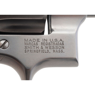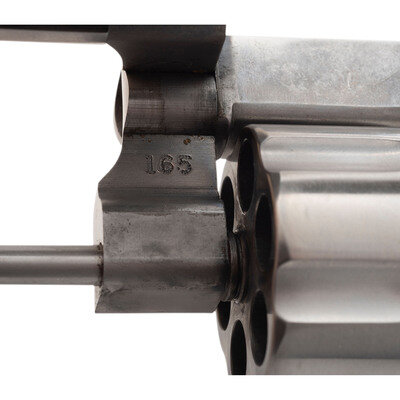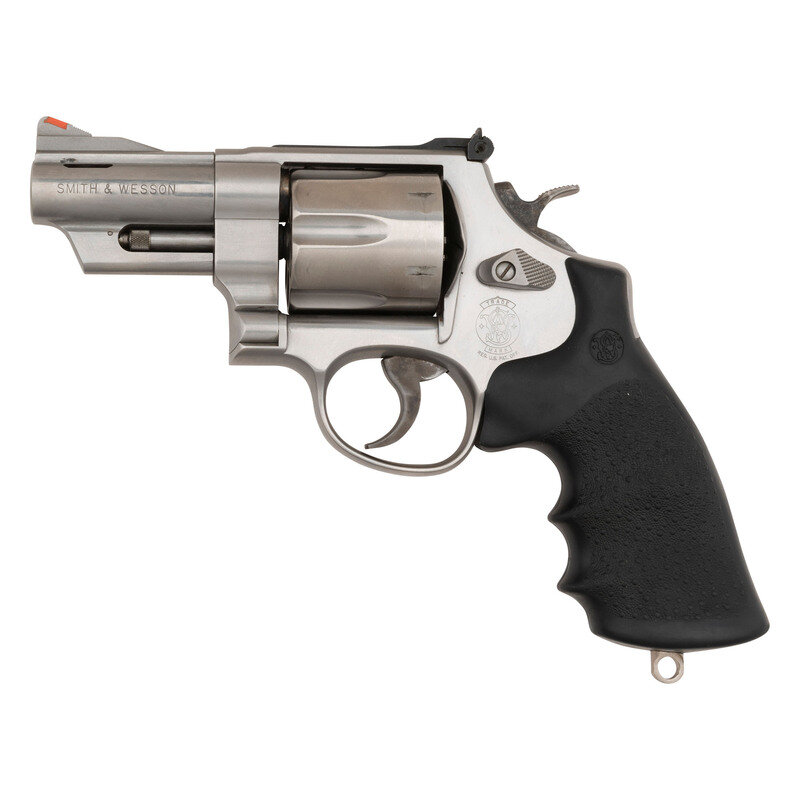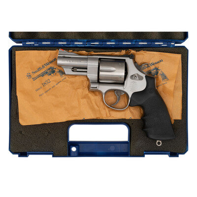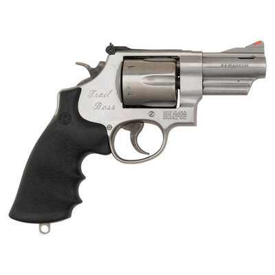 .44 Magnum. 3" barrel length. SN: RSR9600. Brushed stainless steel finish overall with casehardened hammer and trigger, black rubber Smith & Wesson logo grips, and featuring a ported barrel. Double-action hand ejector revolver with fully adjustable rear notch and matted front blade sights. Item shows standard make and model markings, including the Trail/Boss mark on the right frame, and comes with a lanyard loop to the butt doubling as the mounting screw for the grips. Comes in a blue Smith & Wesson hard case with the owner's manual and ad inserts.