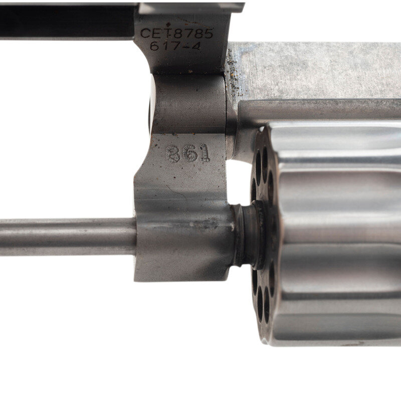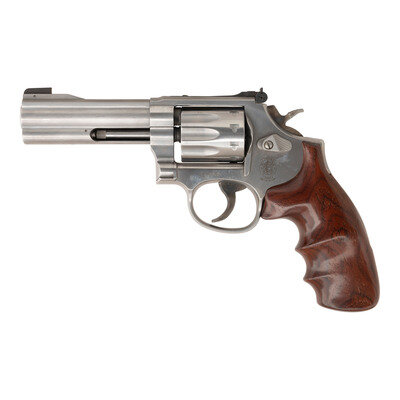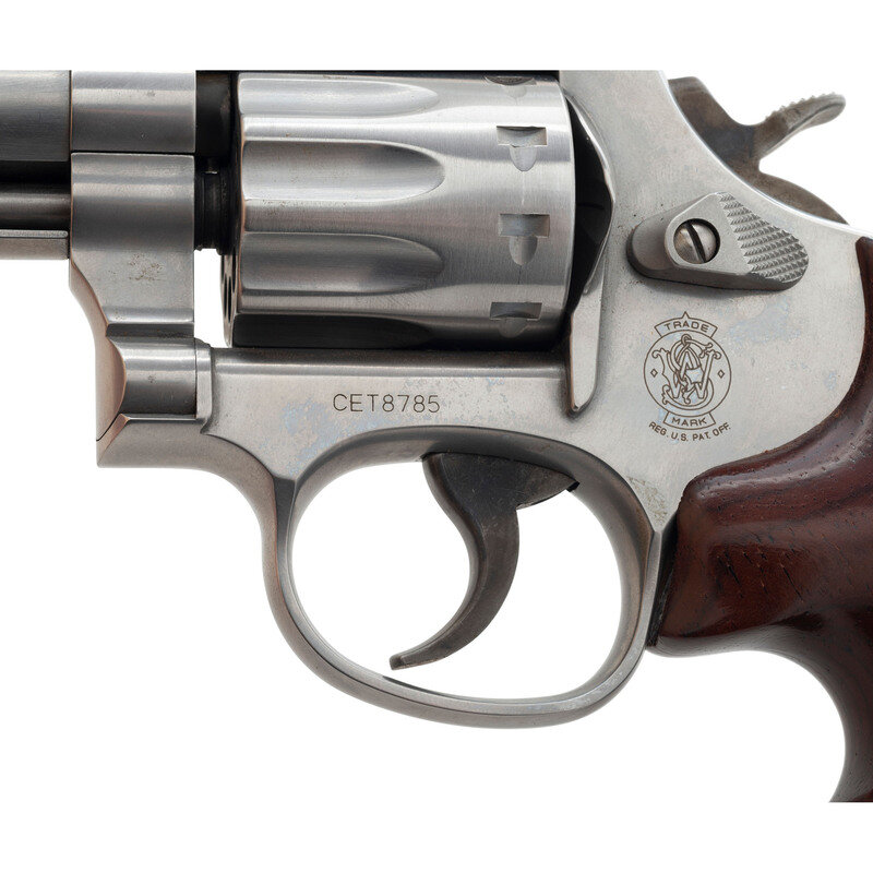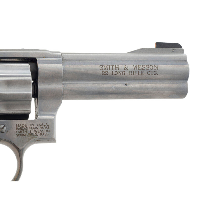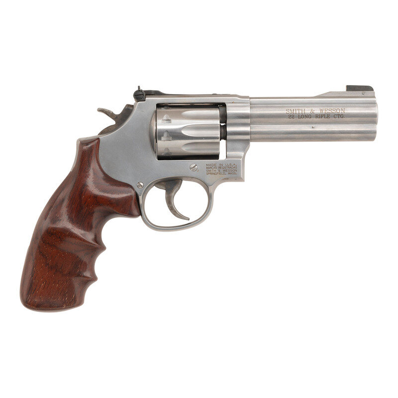 .22 LR. 4" barrel length. SN: CET8785. Brushed stainless steel finish with casehardened hammer and trigger and mounting smooth finger groove wood grips. Double action hand ejector revolver with ten-shot cylinder. Item mounts fully adjustable target rear notch and pinned front blade sights with white dot. The barrel has a full length underlug and a matted rail. Item shows standard make and model markings overall. Comes in a blue Smith & Wesson plastic hard case with the owner's manual and ad inserts.