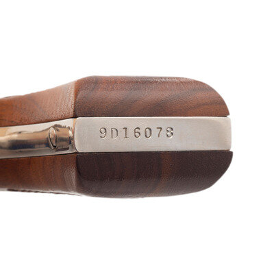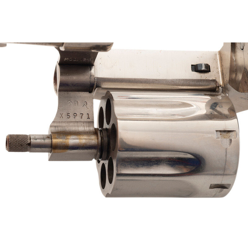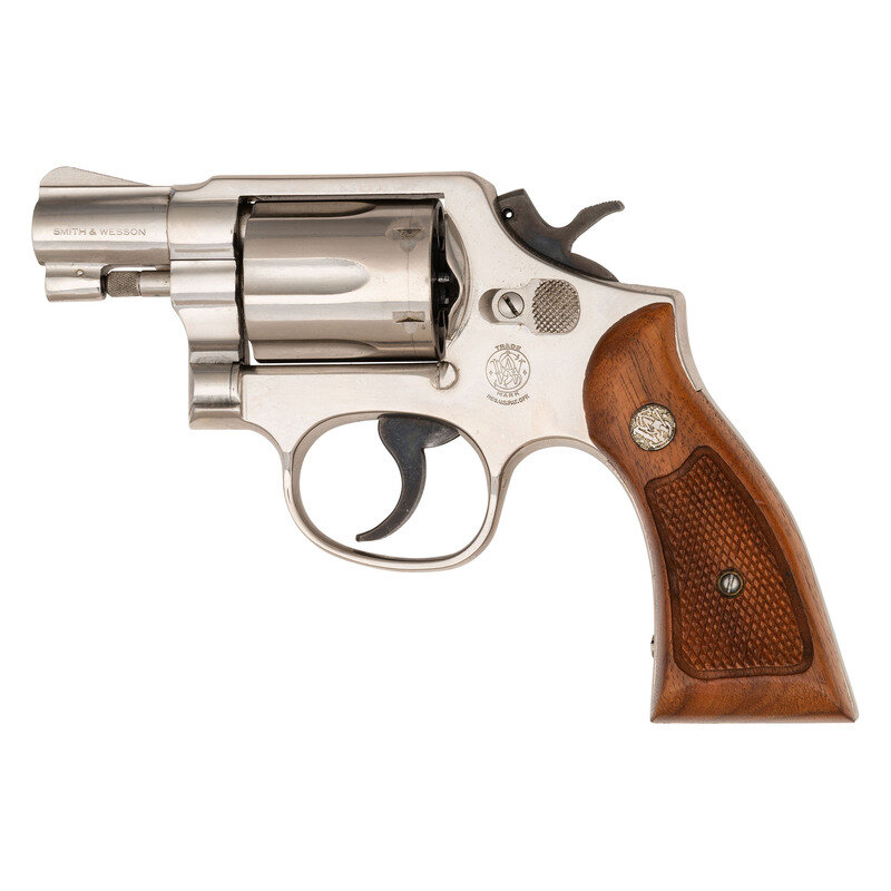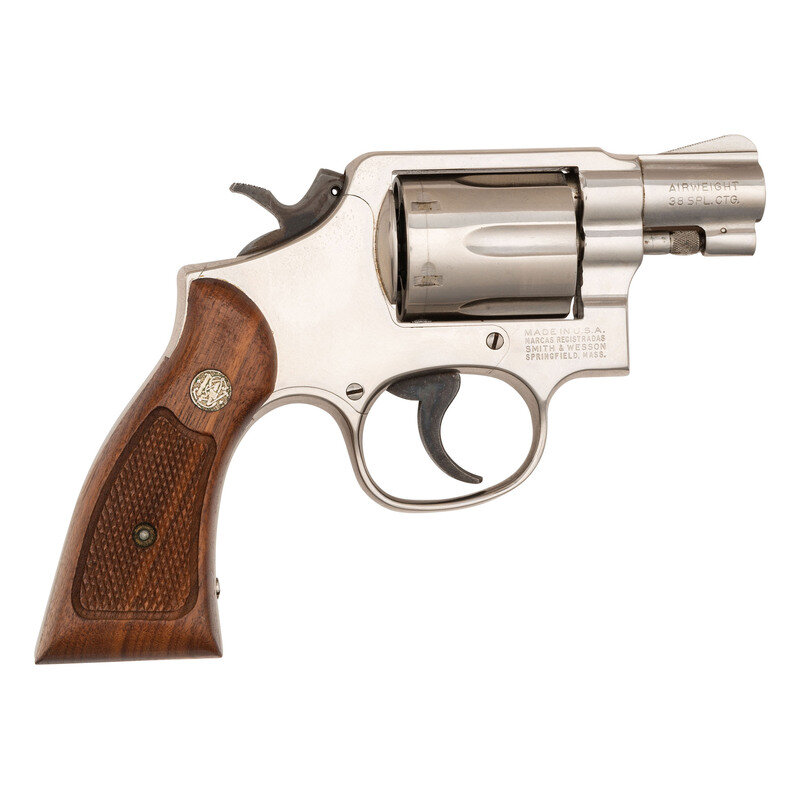 .38 Special. 2" barrel length. SN: 9D16078. Nickel plated finish with casehardened hammer and trigger and mounting checkered walnut Smith & Wesson medallion grips. Double action hand ejector revolver with six-shot cylinder featuring matted front ramp and topstrap notch sights. Item features the standard four-line address mark to the right side of the aluminum frame, along with the AIRWEIGHT mark on the right barrel.