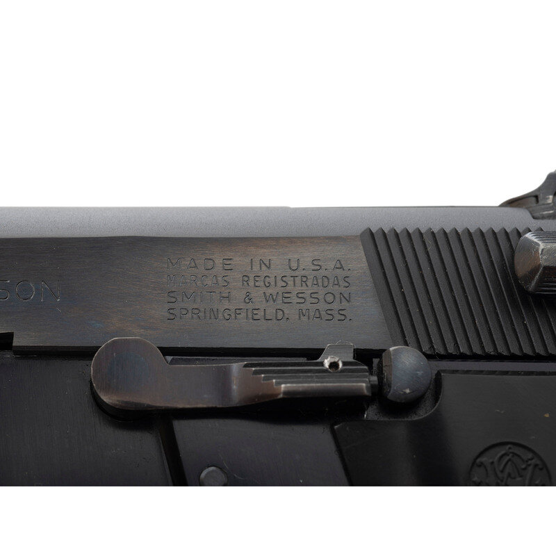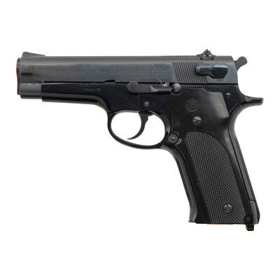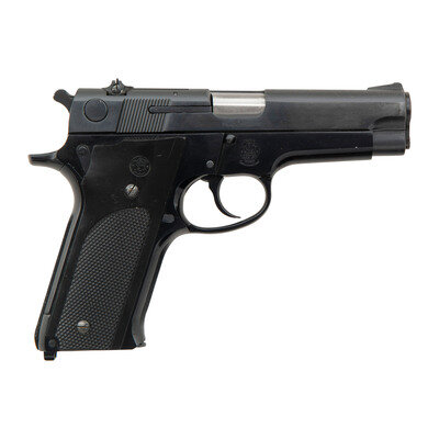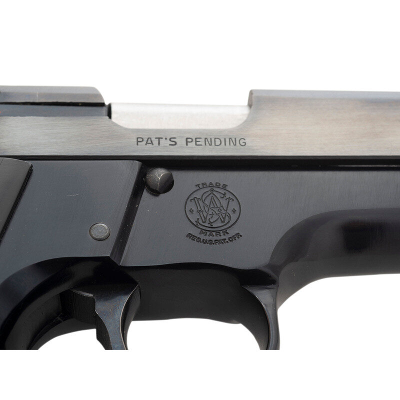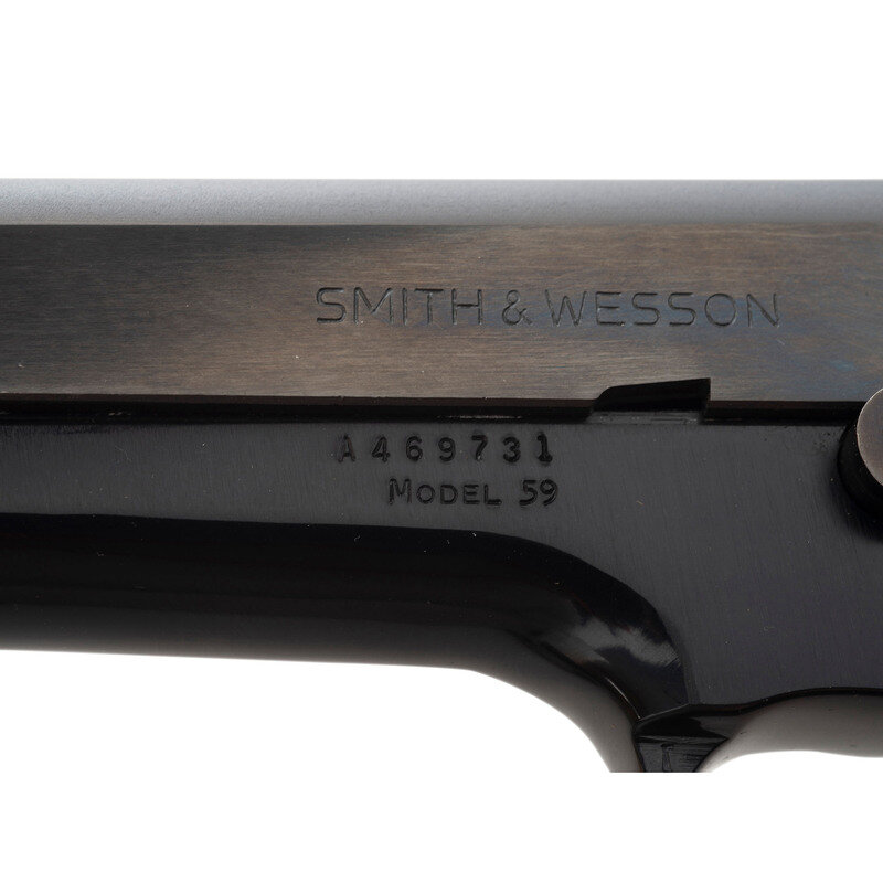 9mm Para. 4" barrel length. SN: A469731. Blued metal finish with black Anodized frame mounting Smith & Wesson logo black synthetic grips. Short recoil operated DA/SA autoloading pistol fed by detachable double stack magazines. Item mounts adjustable target rear and matted front ramp sights with lanyard loop to butt. Safeties include a slide mounted safety/decocker and a magazine safety. Item is marked MODEL 59 on the left frame with Smith & Wesson's monogram trade mark on the right. The left slide shows a four-line address and standard maker markings. Comes in a blue cardboard Smith & Wesson marked box with: one magazine, the owner's manual, warranty card stub, flyers, and an aluminum cleaning rod with copper bore brush.