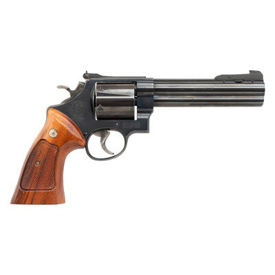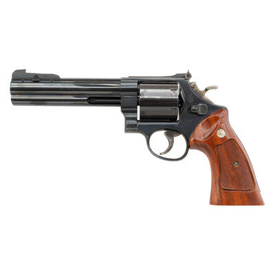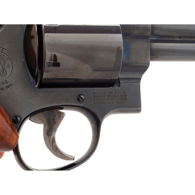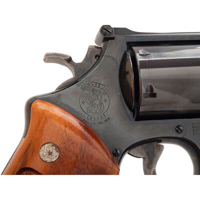 .44 Magnum. 5.875" barrel length. SN: BAR9661. Blued metal finish with refinished cylinder and casehardened finish to the hammer and trigger mounting boxed checkered Smith & Wesson medallion grips. Double action hand ejector six-shot revolver featuring a full length underlug and wide trigger and hammer. The revolver features a three screw frame with no internal safety lock and the firing pin mounted to the hammer. Sights consist of an adjustable rear target notch and Silhouette style four position adjustable front sight. Revolver mounts a round nonfluted cylinder, and shows the standard monogram trademark to the sideplate and four-line address on the right frame. The standard model and caliber marks appear on the interior frame and right barrel respectively.