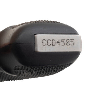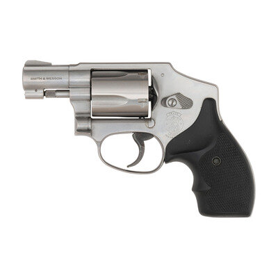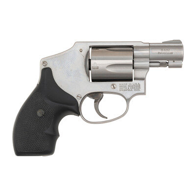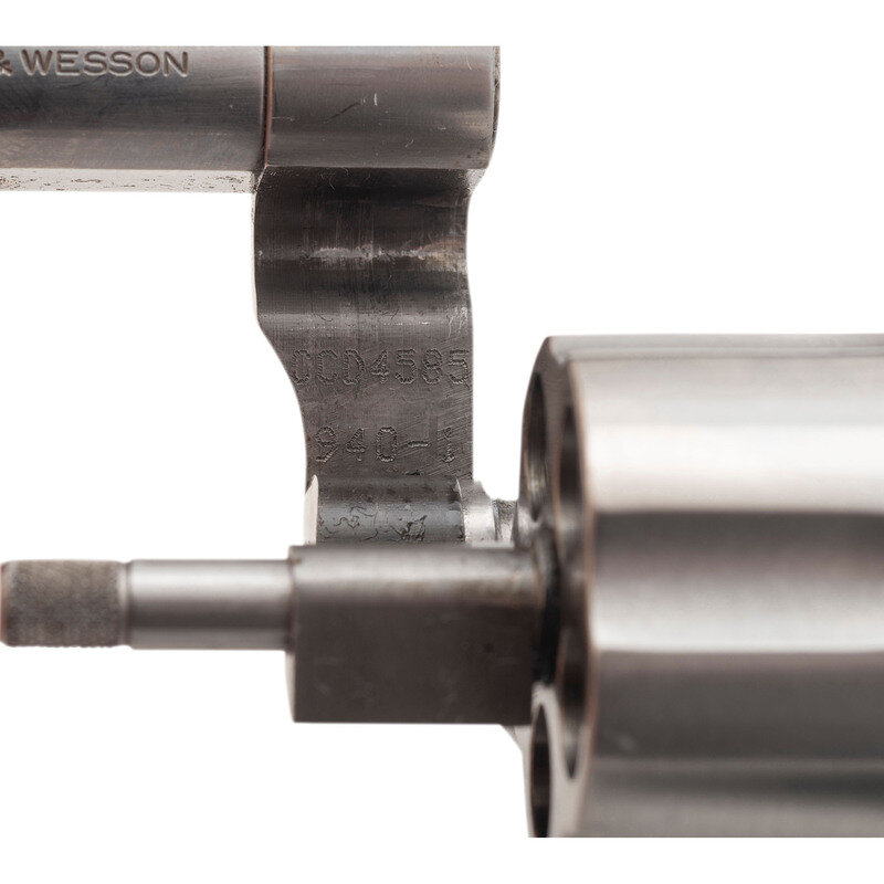 9mm Para. 1.875" barrel length. SN: CCD4585. Brushed stainless steel finish overall with casehardened trigger and mounting black checkered hard rubber grips. DAO hand ejector five-shot revolver with matted front ramp and rear notch sights. The revolver shows standard make and model markings overall including the four-line address to the right frame and Smith & Wesson's monogram trademark to the left. The revolver comes with one full moon clip.