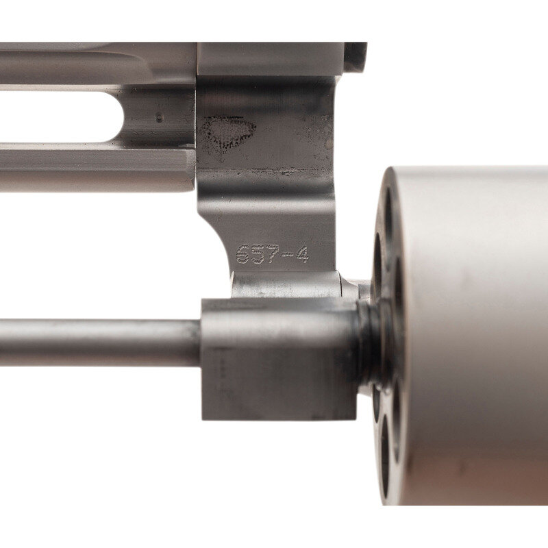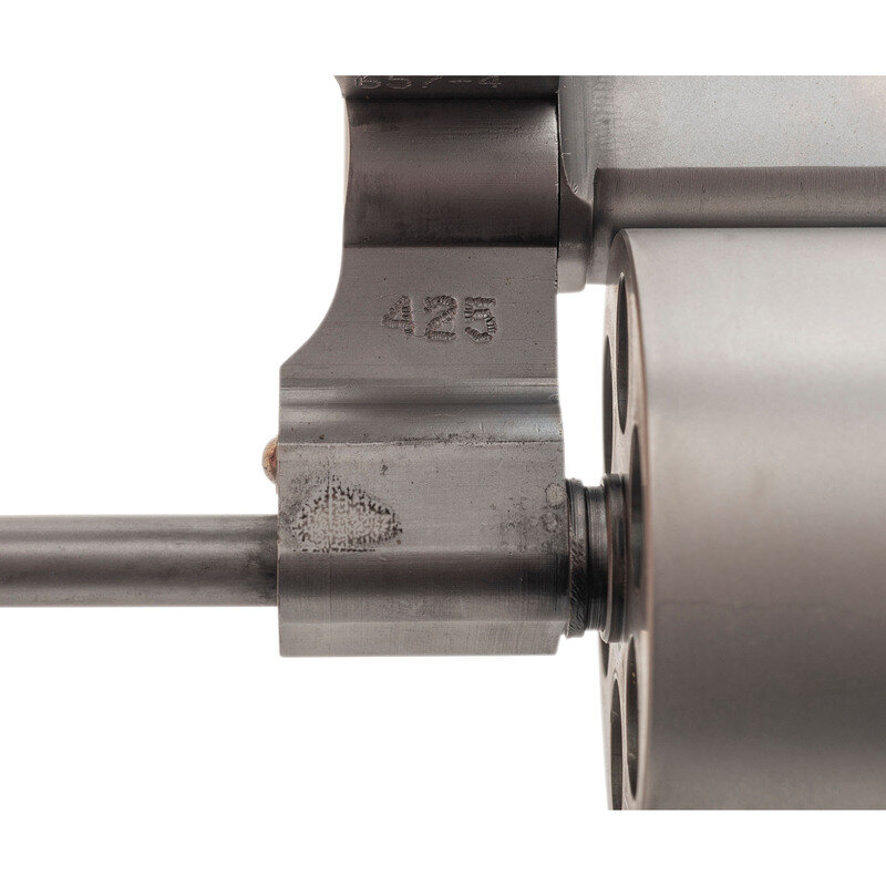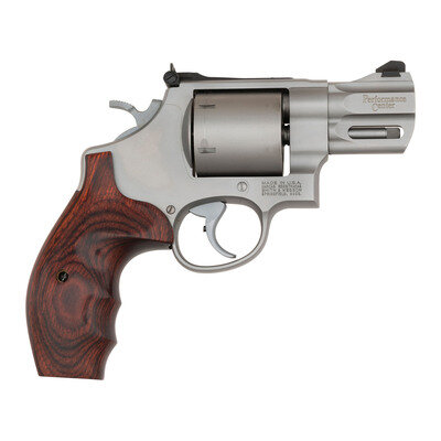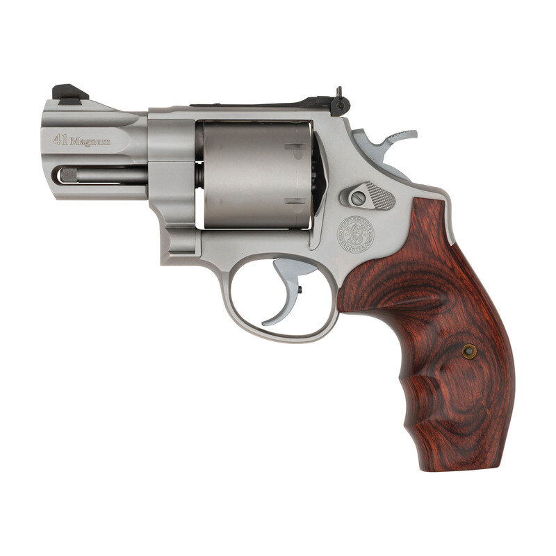 .41 Magnum. 2.5" barrel length. SN: MCS0132. Matte stainless steel finish overall with polished laminated wood grips and mounting a dovetail mounted front blade and adjustable target rear sights. Double action hand ejector six-shot revolver that has been completed without an internal safety lock. The left frame displays Smith & Wesson's Performance Center seal with a further Performance/Center mark to the right barrel. Standard make and model markings appear elsewhere.