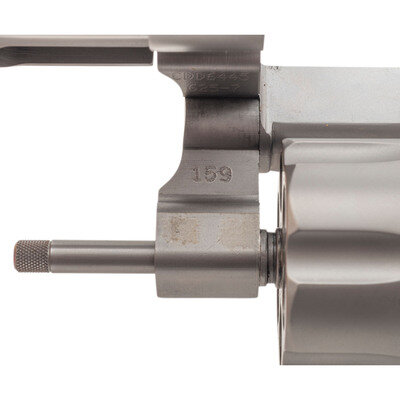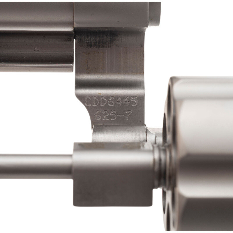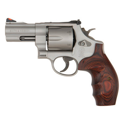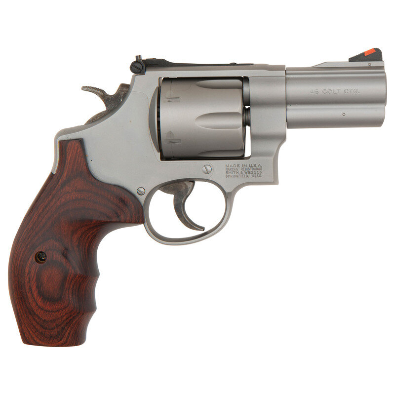 .45 Long Colt. 3" barrel length. SN: CDD6445. Matte stainless steel finish with casehardened hammer and trigger and mounting laminated wood grips. Double action hand ejector revolver mounting adjustable target rear and pinned front blade sights. Revolver completed without an internal safety lock, and is marked with the Smith & Wesson trademark to the left frame. Right frame displays a four-line address marking with standard make and model markings.