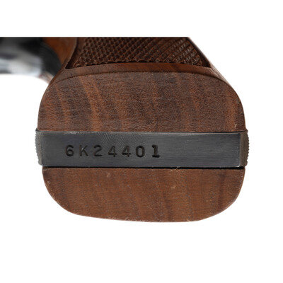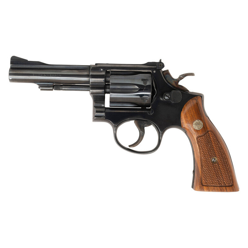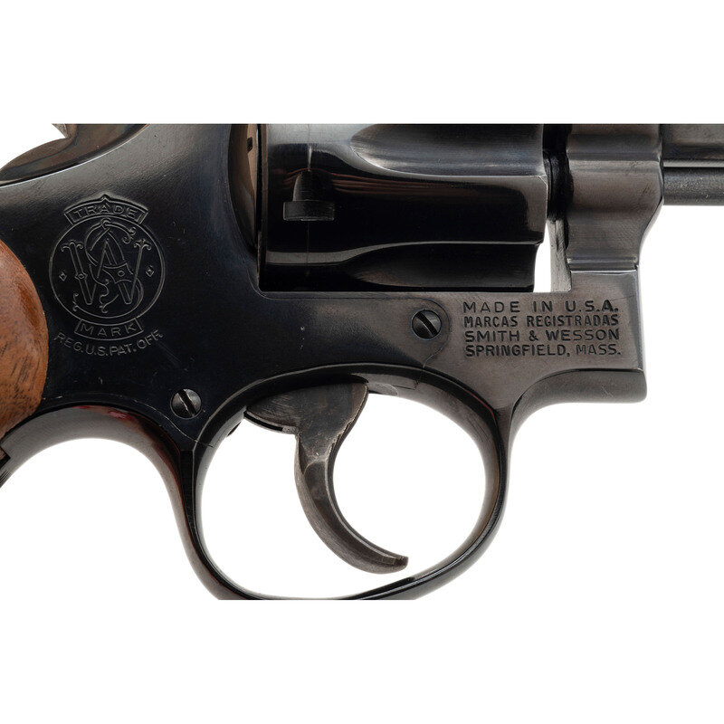 .22 LR. 4" barrel length. SN: 6K24401. Blued metal finish with casehardened hammer and trigger mounting Smith & Wesson medallion checkered Goncalo Alves grips. Double action hand ejector six-shot revolver with full length fluted barrel mounting adjustable target rear and matted front ramp sights. Item features a pinned barrel, three screw frame, and a recessed cylinder. Standard make and model markings overall including MOD. 18-3 to the inner frame and Smith & Wesson's monogram trade mark to the sideplate.