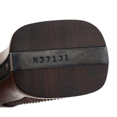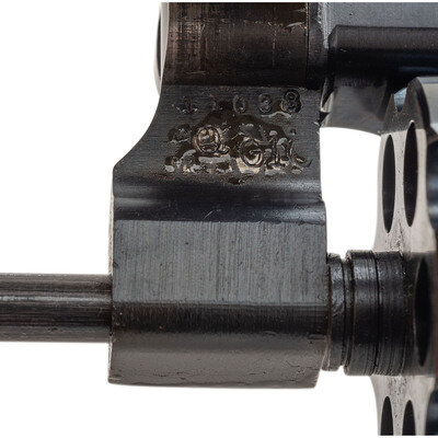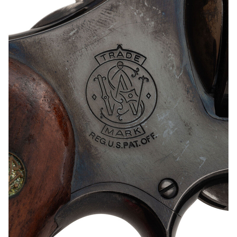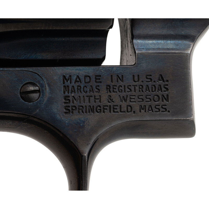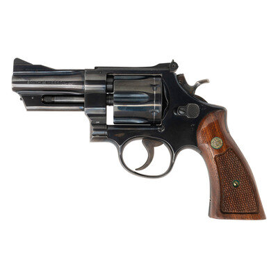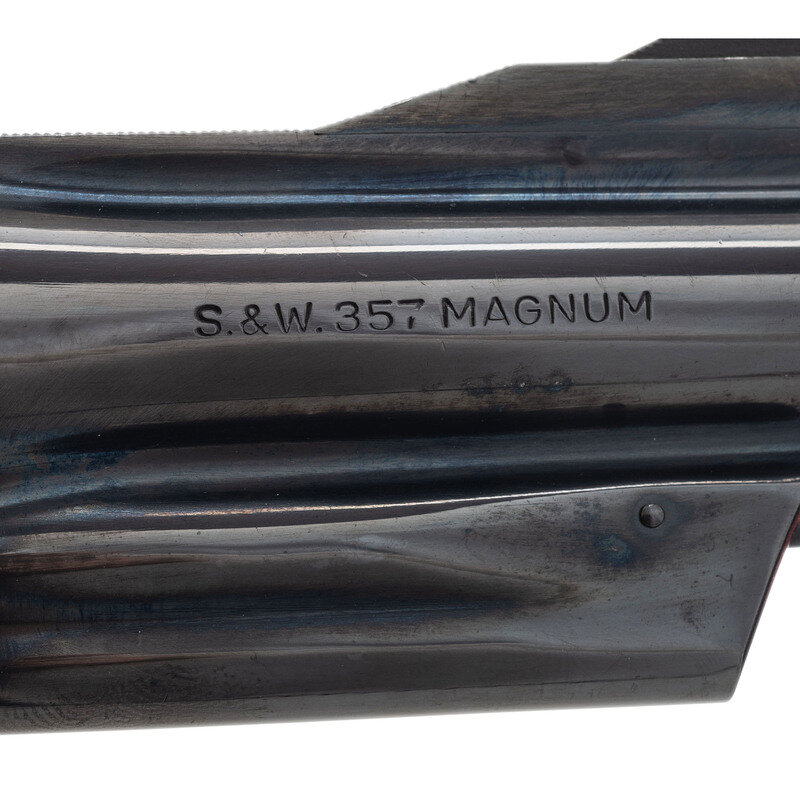 .357 Magnum. 3.5" barrel length. SN: N37131. Blued metal finish with casehardened hammer and trigger and mounting Smith & Wesson medallion checkered walnut grips. Double action hand ejector six-shot revolver with a pinned barrel and three screw frame. Item mounts matted front ramp and fully adjustable target rear sights. Markings include the Smith & Wesson trade mark to the right frame followed by the four-line address marking. Standard make and model markings elsewhere.