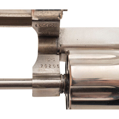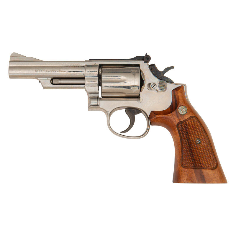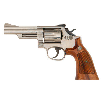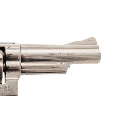 .357 Magnum. 4" barrel length. SN: 51K4216. Nickel plated finish overall with casehardened hammer and trigger mounting Smith & Wesson medallion checkered Goncalo Alves grips. Double action hand ejector six-shot revolver mounting adjustable rear notch and matted front ramp sights atop a matted barrel rib. Revolver features a pinned barrel on a three screw frame with recessed cylinder. Standard make and model markings overall, including the Smith & Wesson trade mark to the right sideplate and four-line address to frame.