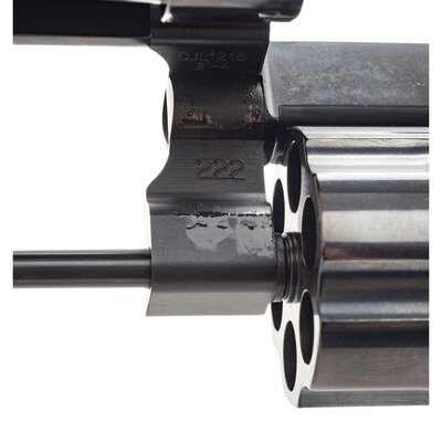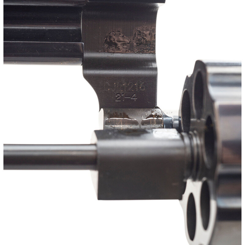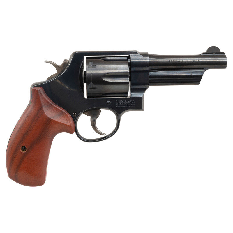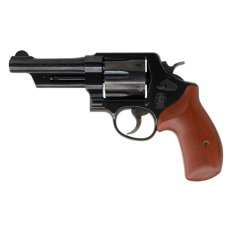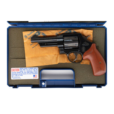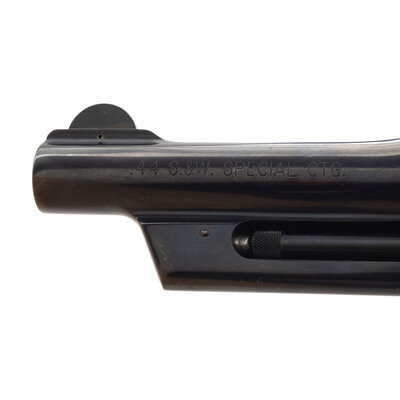 .44 Special. 4" barrel length. SN: CJL1216. Blued metal finish overall with casehardened hammer and trigger, and mounting smooth walnut grips. Double action hand ejector revolver featuring a six-shot cylinder with standard make and model markings overall. The right frame sports a four-line address marking with the left side showing Smith & Wesson's monogram trademark. Sights consist of a topstrap notch and pinned hemispherical front blade sight. Comes in its original blue plastic hard case containing the owner's manual with inserts.