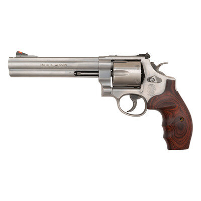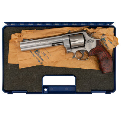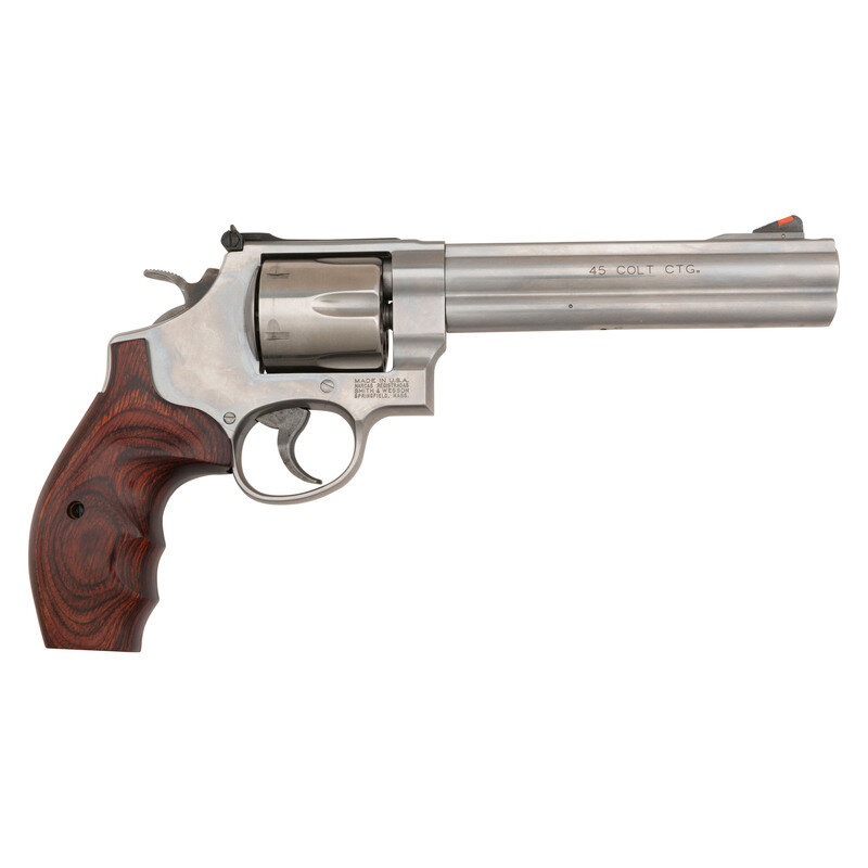 .45 LC. 6.5" barrel length. SN: CDF8254. Brushed stainless steel finish overall featuring casehardened hammer and trigger, and mounting laminated wood stocks. Double action hand ejector six-shot revolver with full length underlug. The barrel features a compensator port forward of the front sight. Item mounts adjustable target rear and red plastic insert matted front ramp sights. Standard make and model markings appear overall, including the four-line Smith & Wesson address to the right frame, and trademark to the left. Comes in its original blue plastic hard case with the owner's manual and ad inserts.
