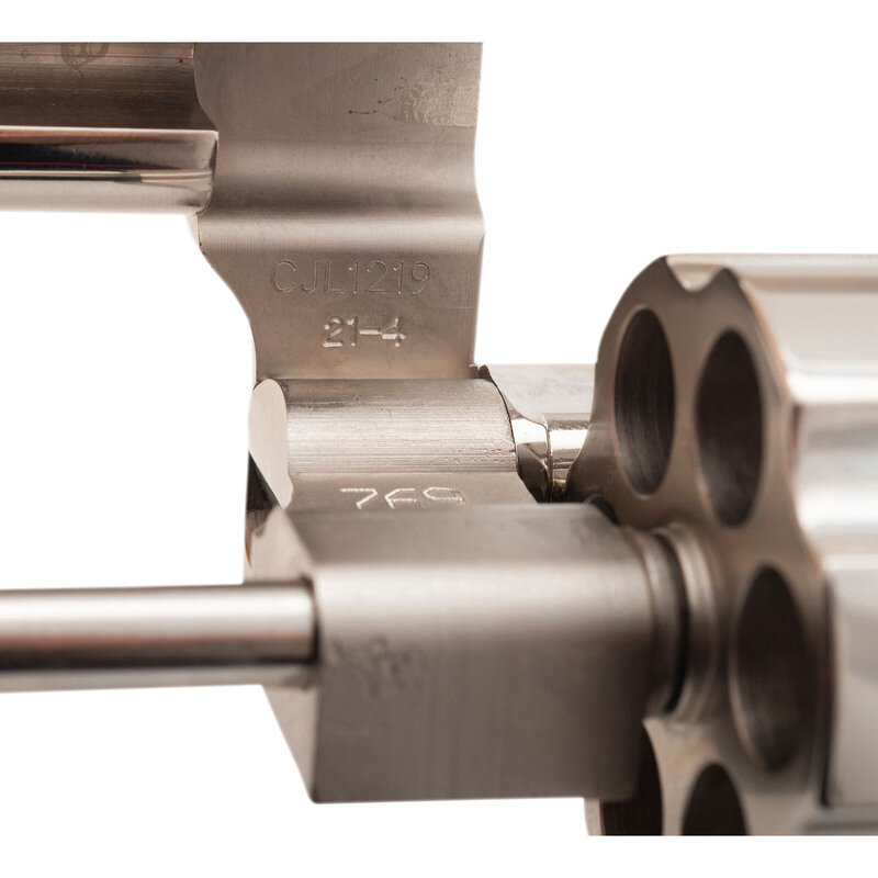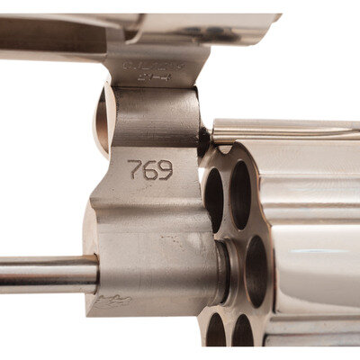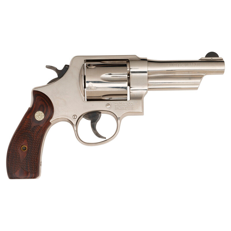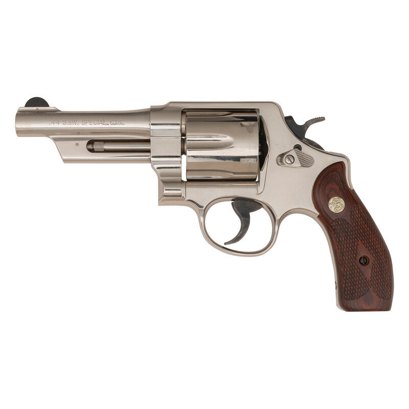 .44 Special. 4" barrel length. SN: CJL1219. Nickel plated finish overall with casehardened hammer and trigger, and mounting laminated wood Smith & Wesson medallion grips. Double action hand ejector revolver with six shot cylinder. Mounts topstrap notch and hemispherical front blade sights. The revolver features Smith & Wesson's internal safety lock. Markings include the standard model mark to the internal frame, and four-line address to the right. Left barrel is marked .44 S.&W. SPECIAL CTG. with SMITH & WESSON on the right. Item comes in a blue plastic Smith & Wesson marked hard case with the owner's manual, two internal safety lock keys, Smith & Wesson's CLUB 1852 card, and a cable lock in its package.