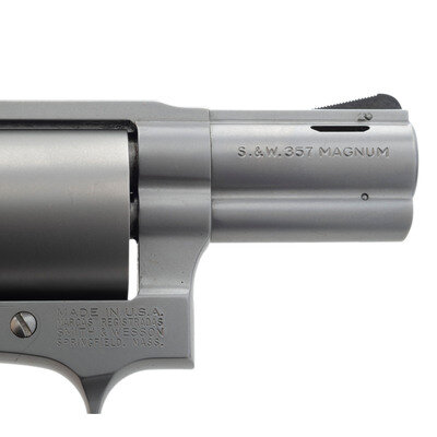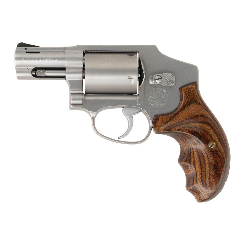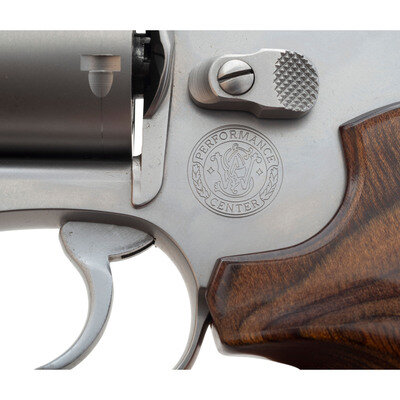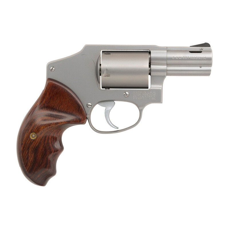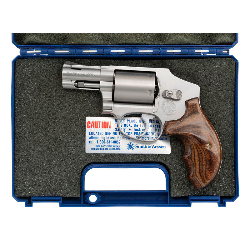 .357 Magnum. 2.125" barrel length. SN: RSR6499. Satin stainless steel finish with laminated wood ACE grips, and featuring a pinned front ramp sight above a ported barrel. DAO hand ejector five-shot revolver constructed without the internal lock. Left frame shows Smith & Wesson's Performance Center seal, and the right displays the four-line address mark. Standard model, make and caliber markings. Comes in its original blue synthetic hard case with an owner's manual, and a Smith & Wesson product registration card.