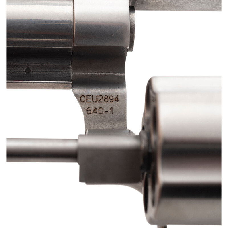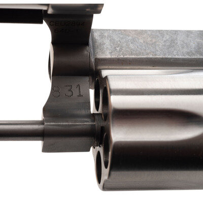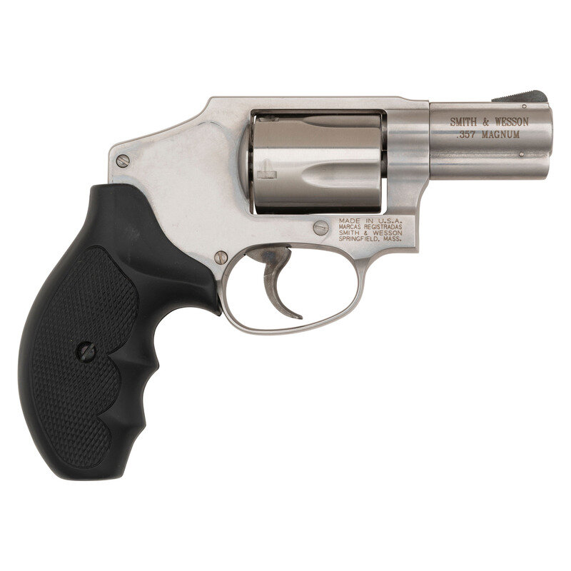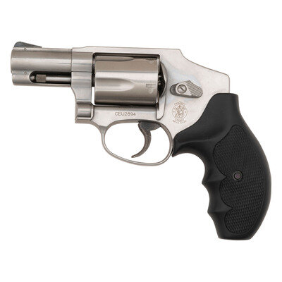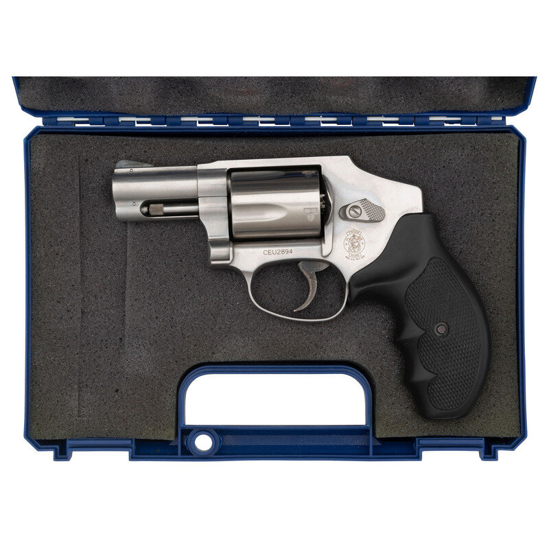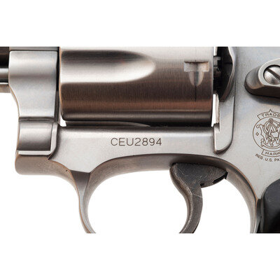 .357 Magnum. 2.125" barrel length. SN: CEU2894. Brushed stainless steel finish overall with textured black synthetic grips mounting topstrap notch and pinned front ramp sights. DAO hand ejector revolver with a five-shot cylinder and casehardened trigger. Item shows standard Smith & Wesson make and model markings overall, and comes in a matching blue plastic case with the owner's manual and inserts.