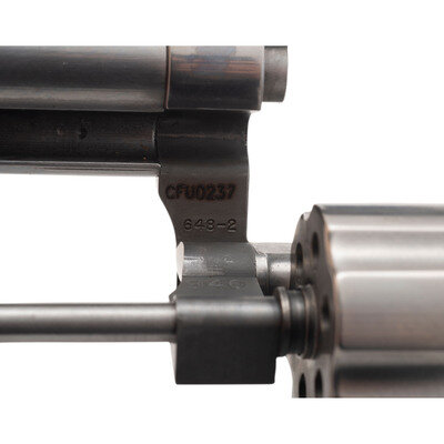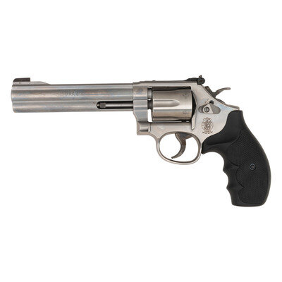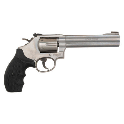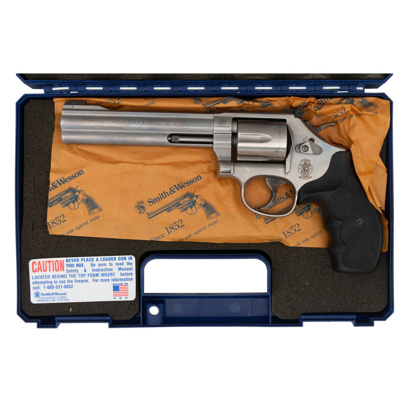 .22 Magnum Rimfire. 5.875" barrel length. SN: CFU0237. Brushed stainless steel finish overall with casehardened hammer and trigger and mounting checkered black rubber grips. Double action hand-ejector six-shot revolver mounting a full length underlug and adjustable rear target with pinned front blade sights. Item shows standard make and model markings, and features Smith & Wesson's internal safety lock system. Comes in a blue plastic Smith & Wesson hard case with two internal safety lock keys, and the owner's manual with ad inserts.