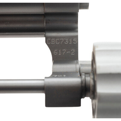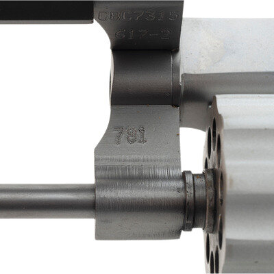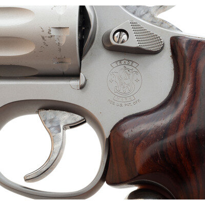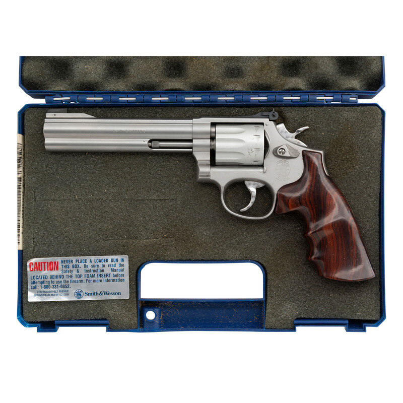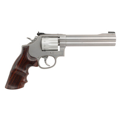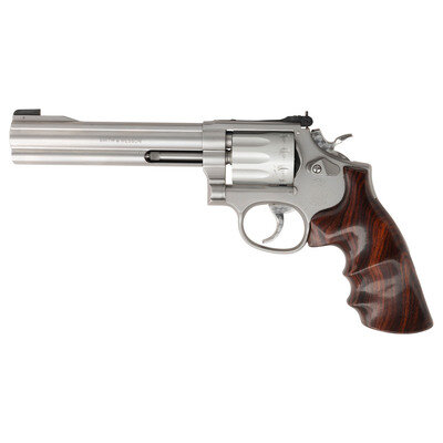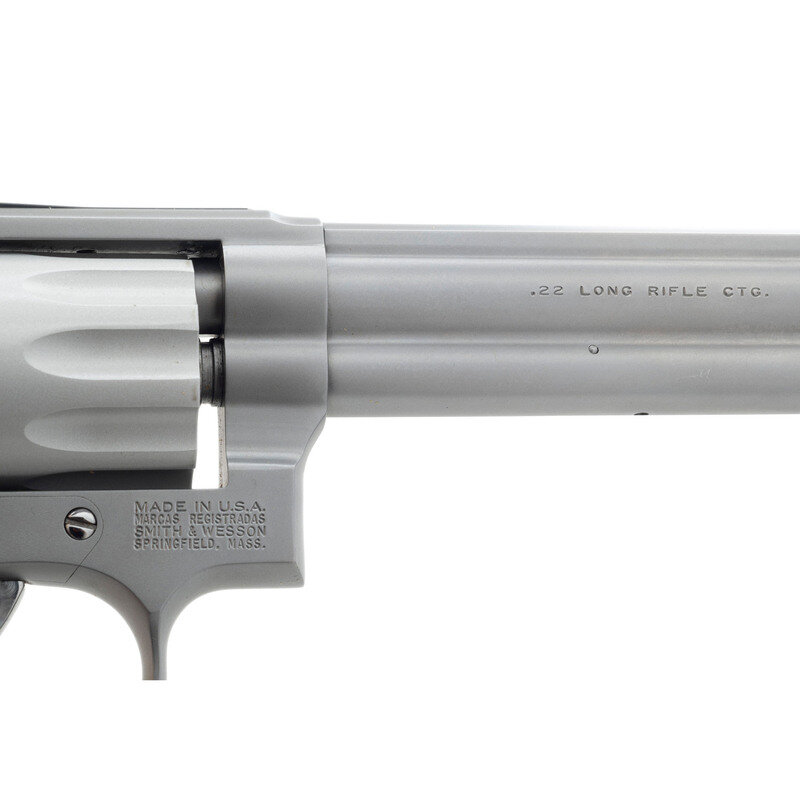 .22 LR. 5.75" barrel length. SN: CBC7315. Satin stainless steel finish overall with non matching cylinder finish, jeweled hammer and trigger, and mounting laminated wood grips. Double action hand ejector ten-shot revolver mounting a full length underlug. Fully adjustable target rear and pinned front blade sights. Item shows standard manufacturer markings including the four-line address on the right frame. Item has not been fitted for the internal safety lock. Item comes in its original blue synthetic hard case with an owner's manual with inserts.