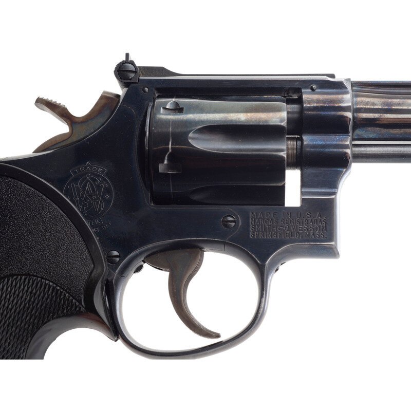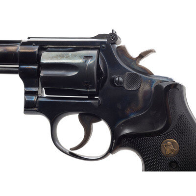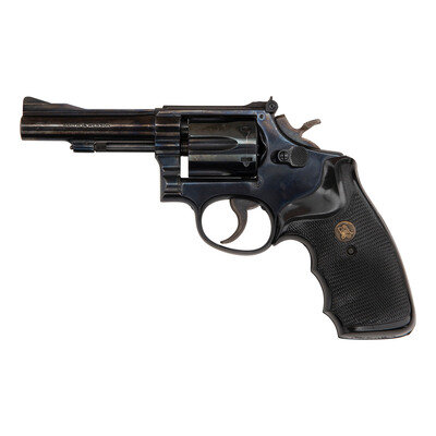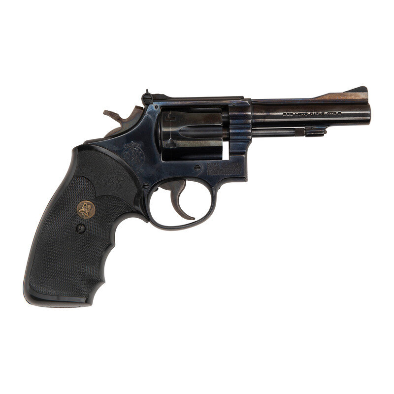 .22 LR. 4" barrel length. SN: K397470. Blued metal finish with case hardened finish to trigger and hammer. Grips are checkering hard rubber with brass Pachmayr medallions. Double action revolver with adjustable notch rear sight, ramp blade front sight, and a fluted 6-shot swing out cylinder.