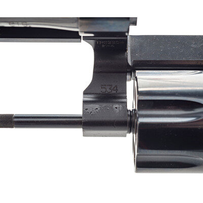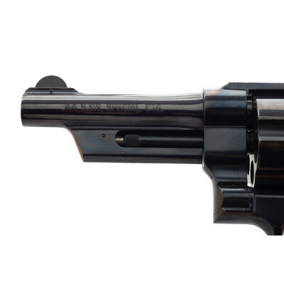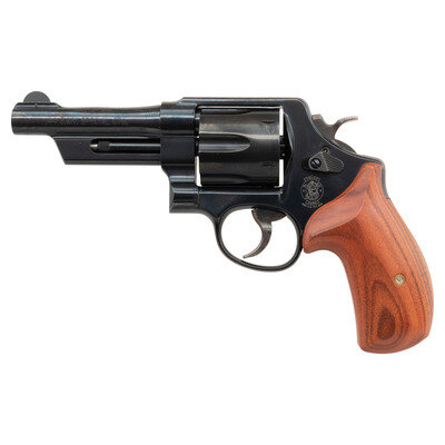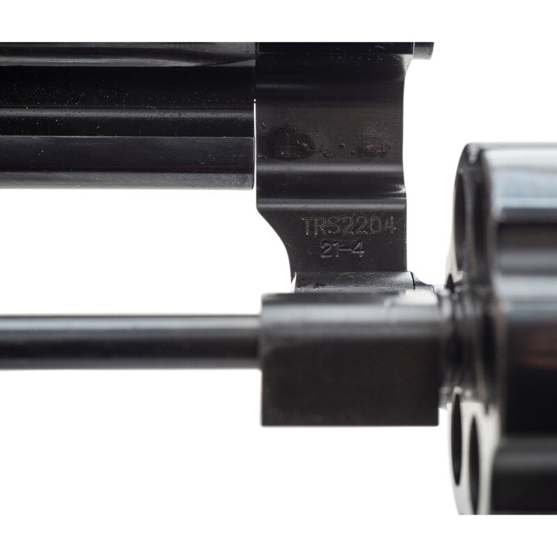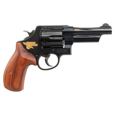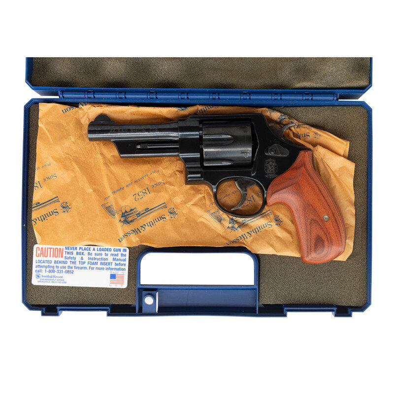 .44 Special. 4" barrel length. SN: TRS2204. Blued metal finish overall with casehardened hammer and trigger, and mounting smooth walnut grips. Double action hand ejector revolver with six-shot cylinder and Smith & Wesson's internal safety lock. Item mounts topstrap notch and pinned front half-circle blade sights. The right frame features a gold THUNDER/RANCH marking along with standard make and model markings overall. Comes in its original blue plastic hard case with the owner's manual, two internal safety lock keys, a cable lock in its package, and Smith & Wesson's CLUB 1852 flyer.