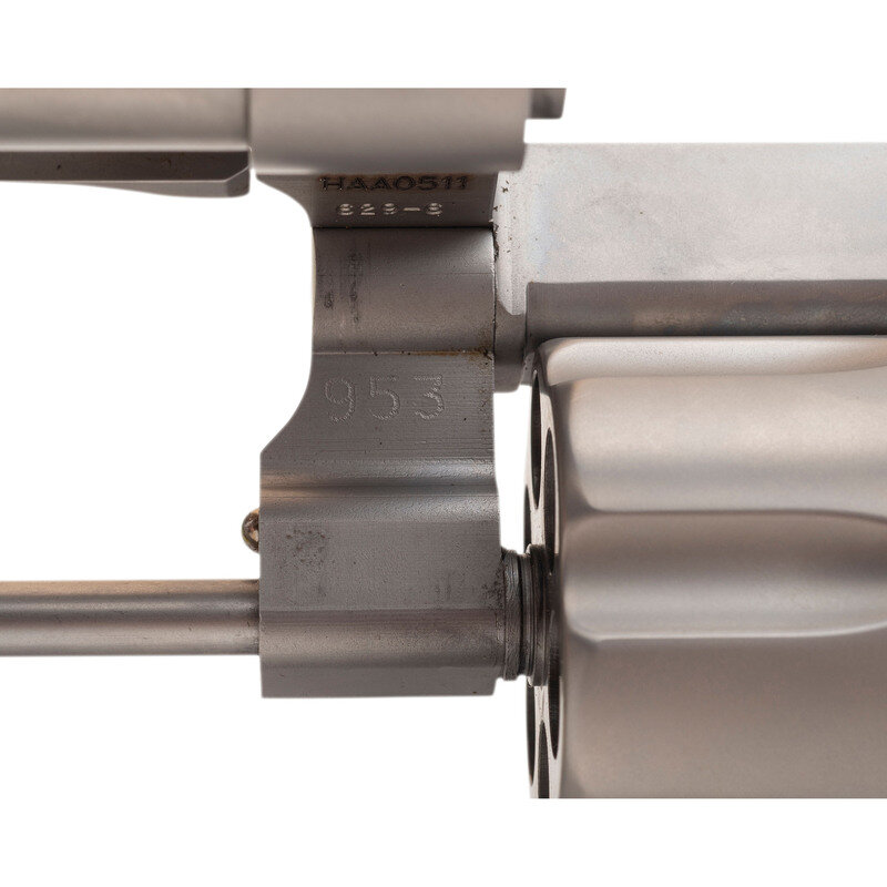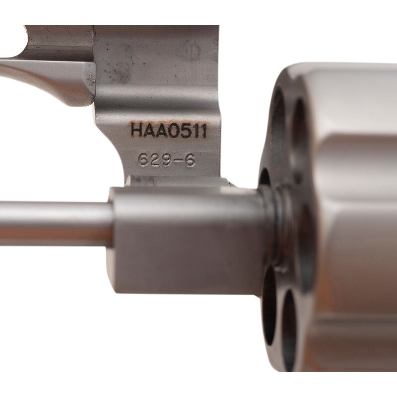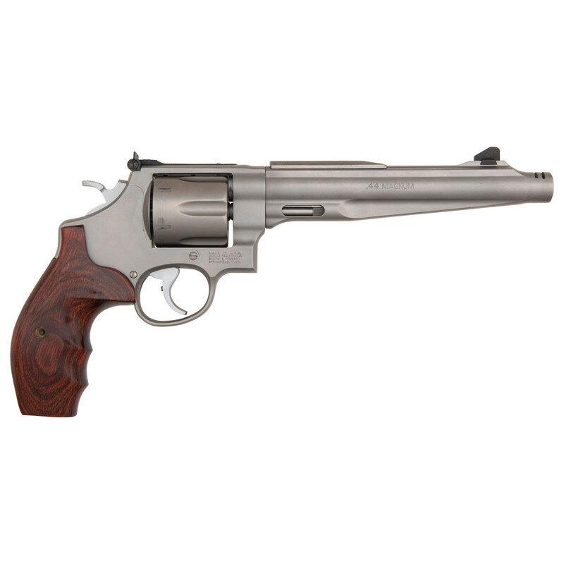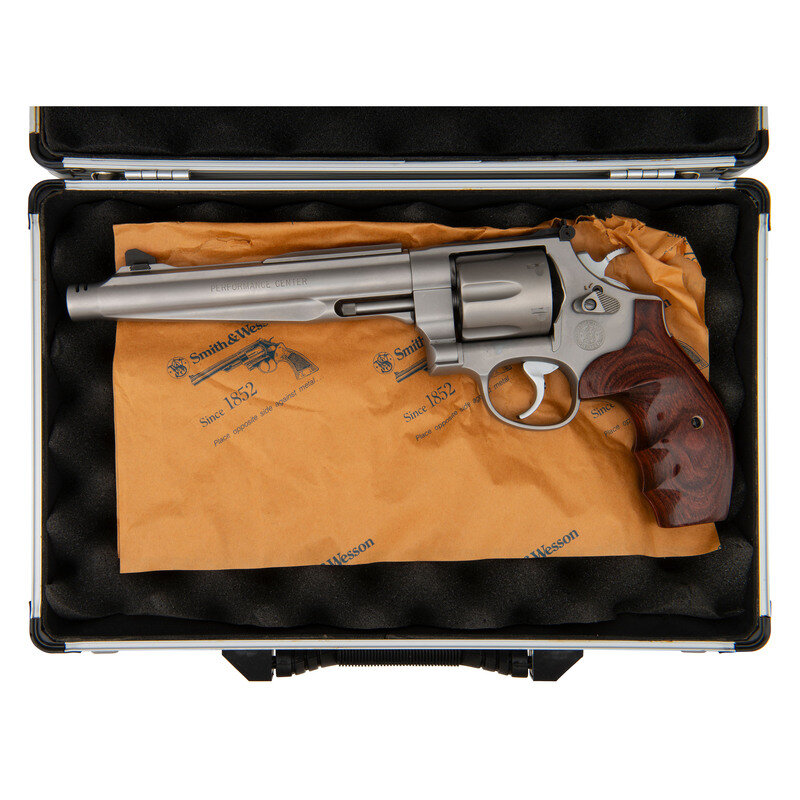 .44 Magnum. 7.5" barrel length. SN: HAA0511. Matte stainless steel finish overall with polished laminated wood grips and mounting a compensated muzzle and adjustable target sights. Double action hand-ejector revolver with six-shot cylinder and the barrel drilled and tapped for optics mounting. Item features the PERFORMANCE/CENTER seal on the left frame and left barrel, and standard make and model markings overall. Item features an internal safety lock. Comes in an aluminum case with the PERFORMANCE/CENTER seal affixed to the lid. Included in the case are two internal safety lock keys, an optional Weaver rail mount, and the owner's manual with inserts.