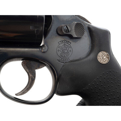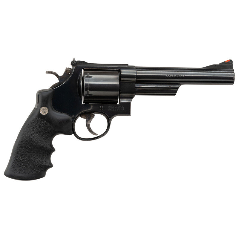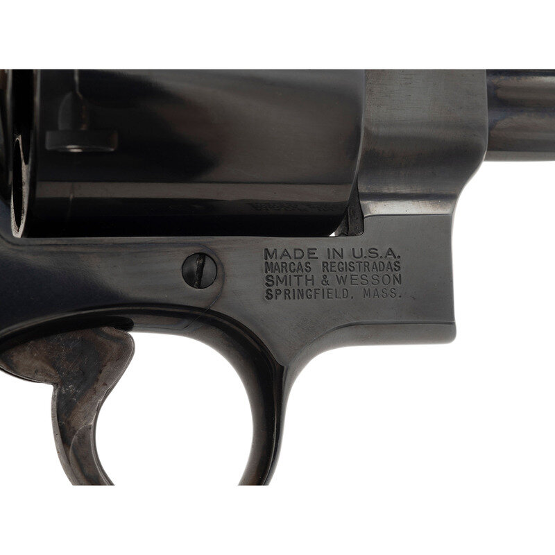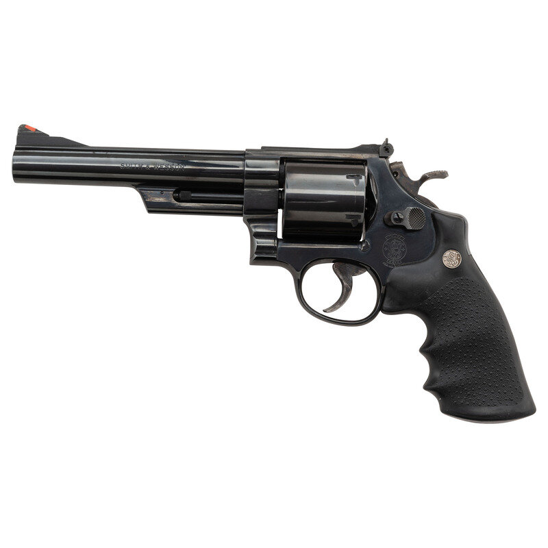 .44 Magnum. 6" barrel length. SN: BEZ6665. Blued metal finish with casehardened wide trigger and hammer with Smith & Wesson medallion black rubber HOGUE grips. Double action hand ejector six-shot revolver mounting fully adjustable rear target and matted front ramp sights. Item features a non-pinned barrel in a three screw frame with no internal safety lock. Markings include the standard Smith & Wesson trade mark on the left frame, and the model marking MOD. 29-5 to the inner frame. Comes in a matching blue cardboard box containing the owner's manual with inserts.