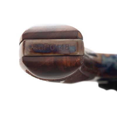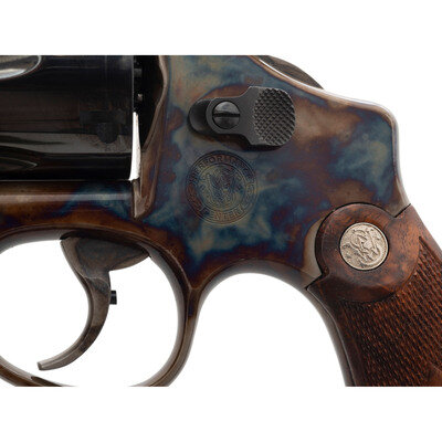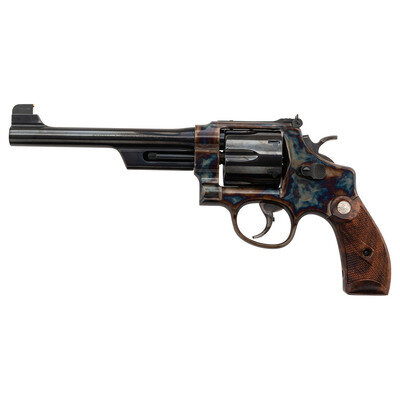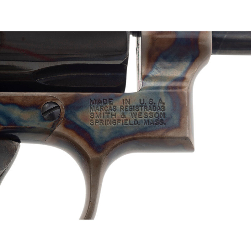 .45 Long Colt. 6.5" barrel length. SN: GBP0148. Blued metal finish with case colored frame and casehardened hammer and trigger mounting checkered walnut Smith & Wesson medallion grips. Double action hand ejector revolver with six-shot cylinder mounting adjustable target rear and gold bead front sights. The left frame shows Smith & Wesson's performance center logo with the right featuring the four-line address mark. Flanks of the barrel feature standard manufacturer and caliber markings. Item comes in a matching HERITAGE SERIES marked cardboard box.