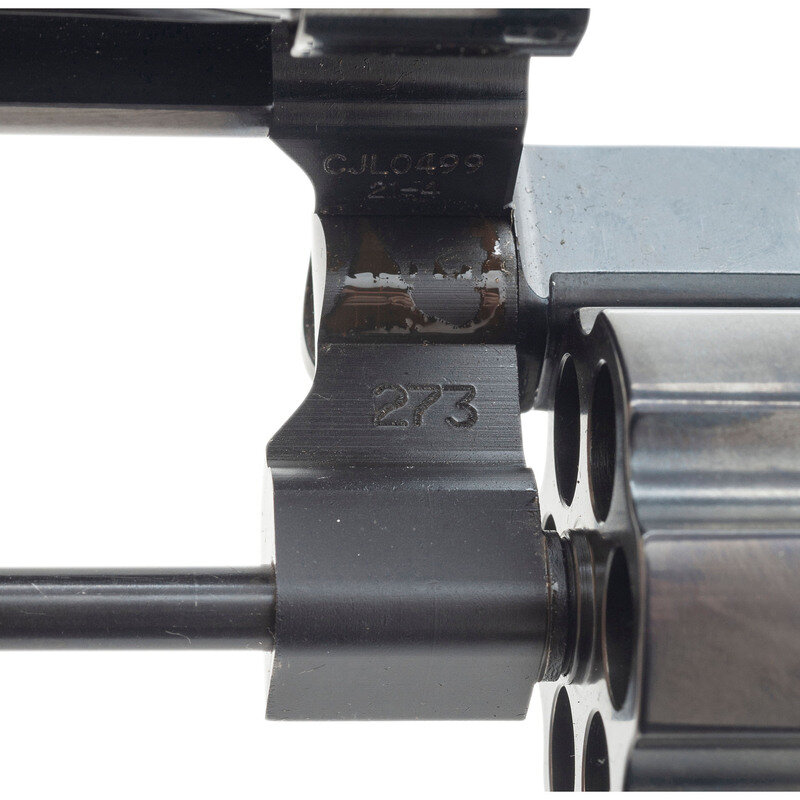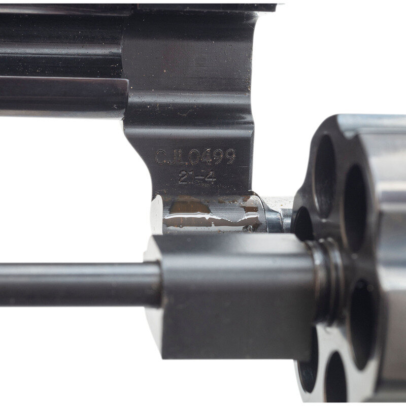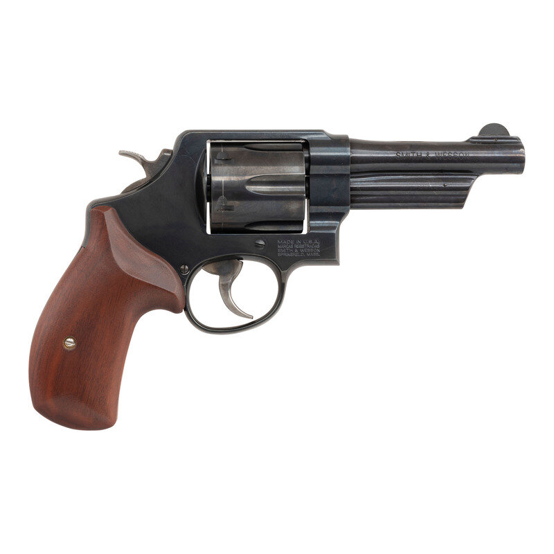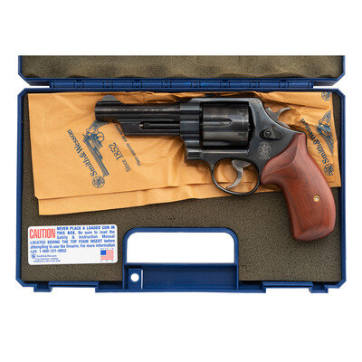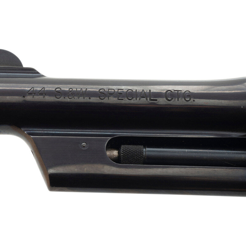 .44 Special. 4" barrel length. SN: CJL0499. Blued metal finish with casehardened hammer and trigger mounting smooth walnut grips. Double action hand ejector six-shot revolver mounting pinned half moon front blade and topstrap notch sights. The revolver shows the standard four-line Smith & Wesson address on the right frame, and the trade mark on the left. Barrel markings include .44 S.&W. SPECIAL CTG. on the left and SMITH & WESSON on the right. Standard model marking appears on the inner frame, and the revolver mounts the inner safety lock. Comes in its original blue plastic hard case with: two internal safety lock keys, Smith & Wesson Club 1852 registration card, owner's manual, and a cable lock.