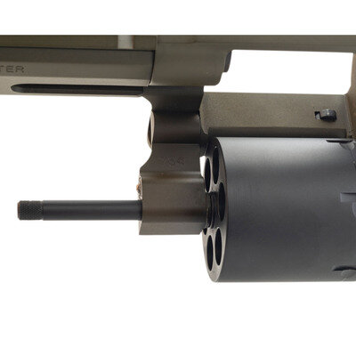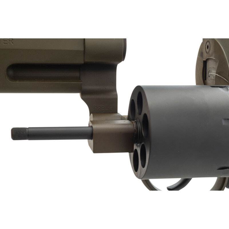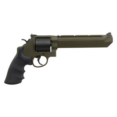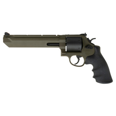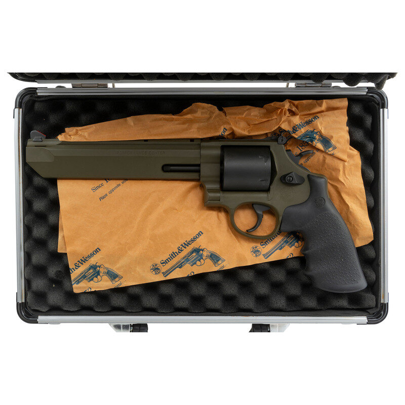 .44 Magnum. 7.5" barrel length. SN: FBS0035. Green Cerakote finish with black Armornite finished small parts and mounting Smith & Wesson monogram black rubber grips. Double action hand ejector revolver featuring a full length underlug and weaver rail atop a ported barrel. The barrel features two ports, one on either side of the red front sight. The revolver features an adjustable target rear sight and does not mount the internal safety lock system. Left frame sports Smith & Wesson's {PERFORMANCE/CENTER} seal. Further marks include the four-line address to the right frame, and PERFORMANCE CENTER on the left barrel. Item comes in an aluminum case that features an additional {PERFORMANCE/CENTER} seal on the lid. Comes with the owner's manual with inserts.