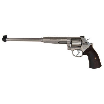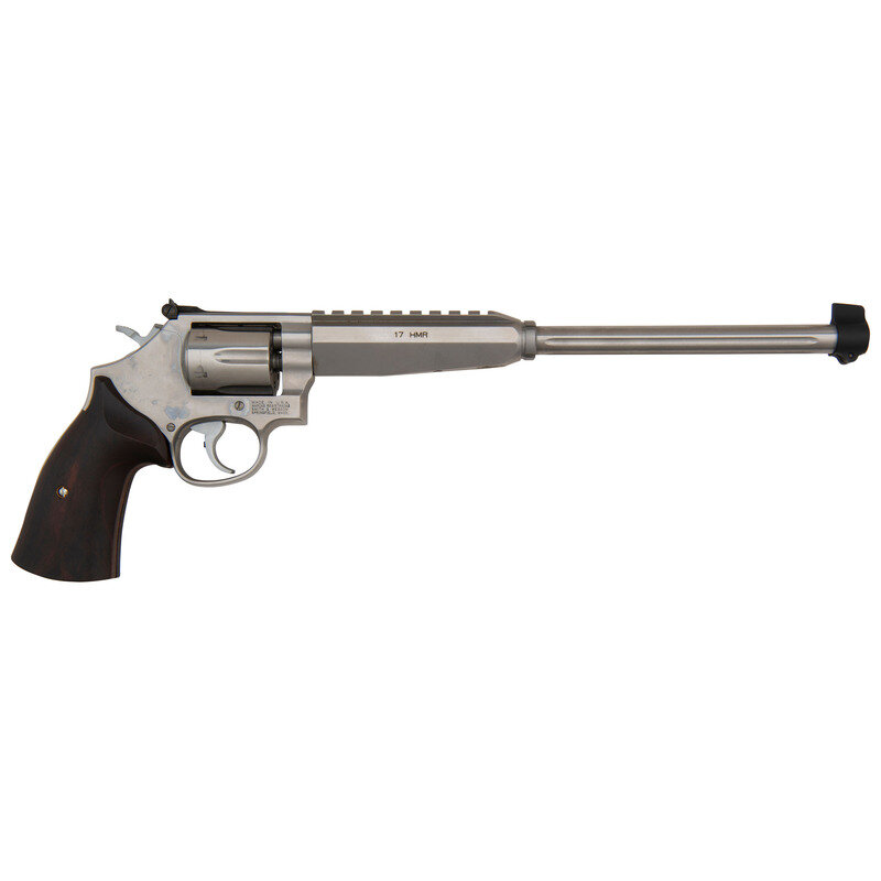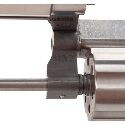 .17HMR. 12" fluted barrel. SN: VAR0126. Satin stainless steel finish, smooth two-piece wood grain synthetic grips. Double action revolver with six-chambered fluted swing out cylinder, adjustable target rear sight and blade front sight, Picatinny rail system and integral safety locking system. Revolver is contained in a Performance Center Cordura zipper bag with factory paperwork and keys for the locking mechanism and a cable gun lock.
